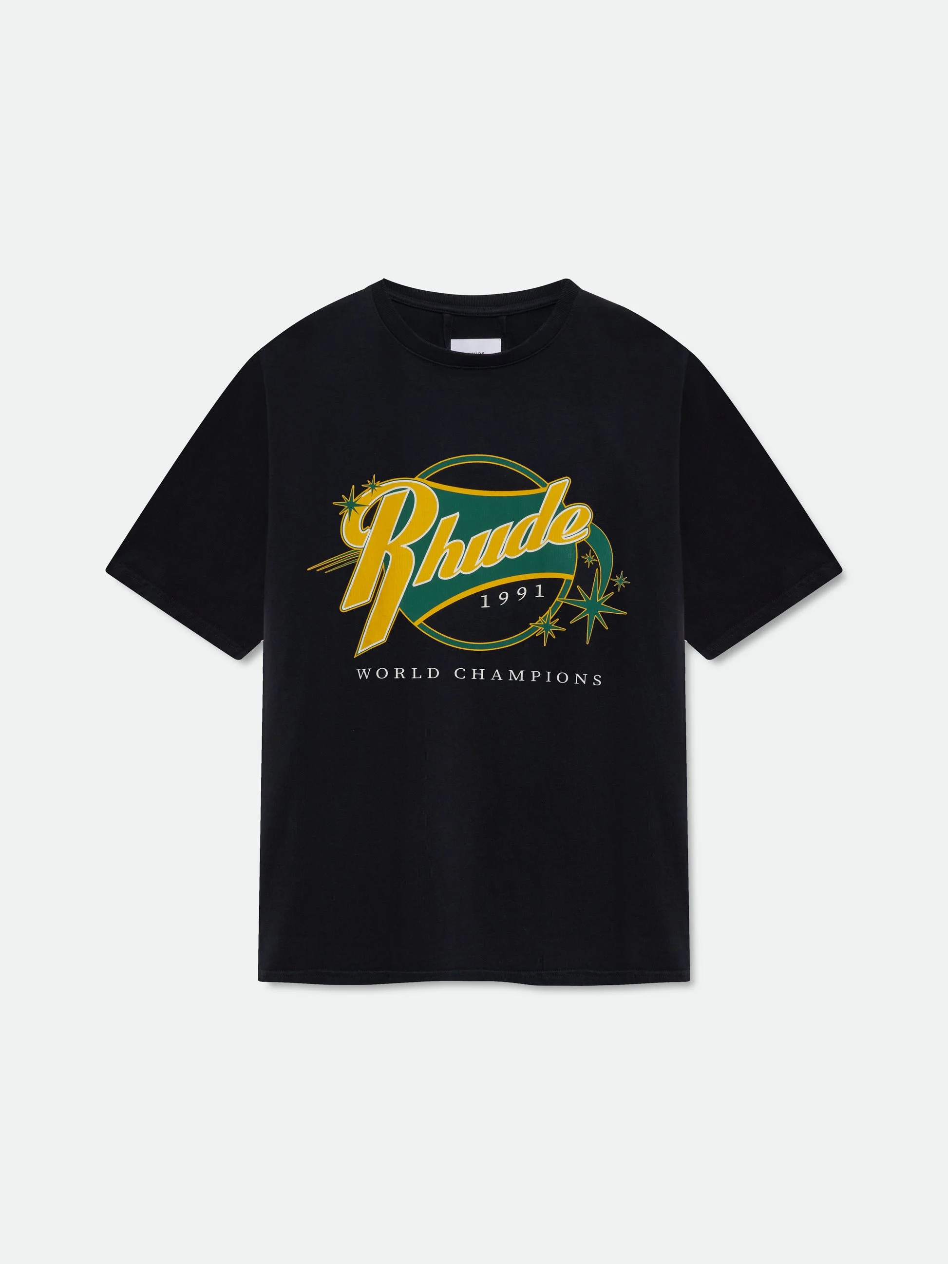 Custom-fit vintage wash cotton short sleeve tee-shirt with Rhude "World Champions" graphics printed at front, with a clean back. 100% COTTON