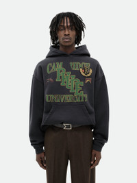 Long sleeve French Terry hoodie with Rhude University graphics printed at front, embroidered R crest patch at chest, with a clean back. Featuring a kangaroo front pocket and dropped shoulders. Each piece is unique and print distressing my vary per style. 100% COTTON