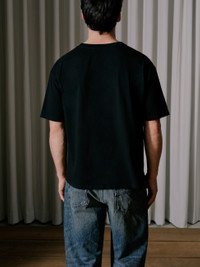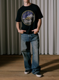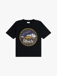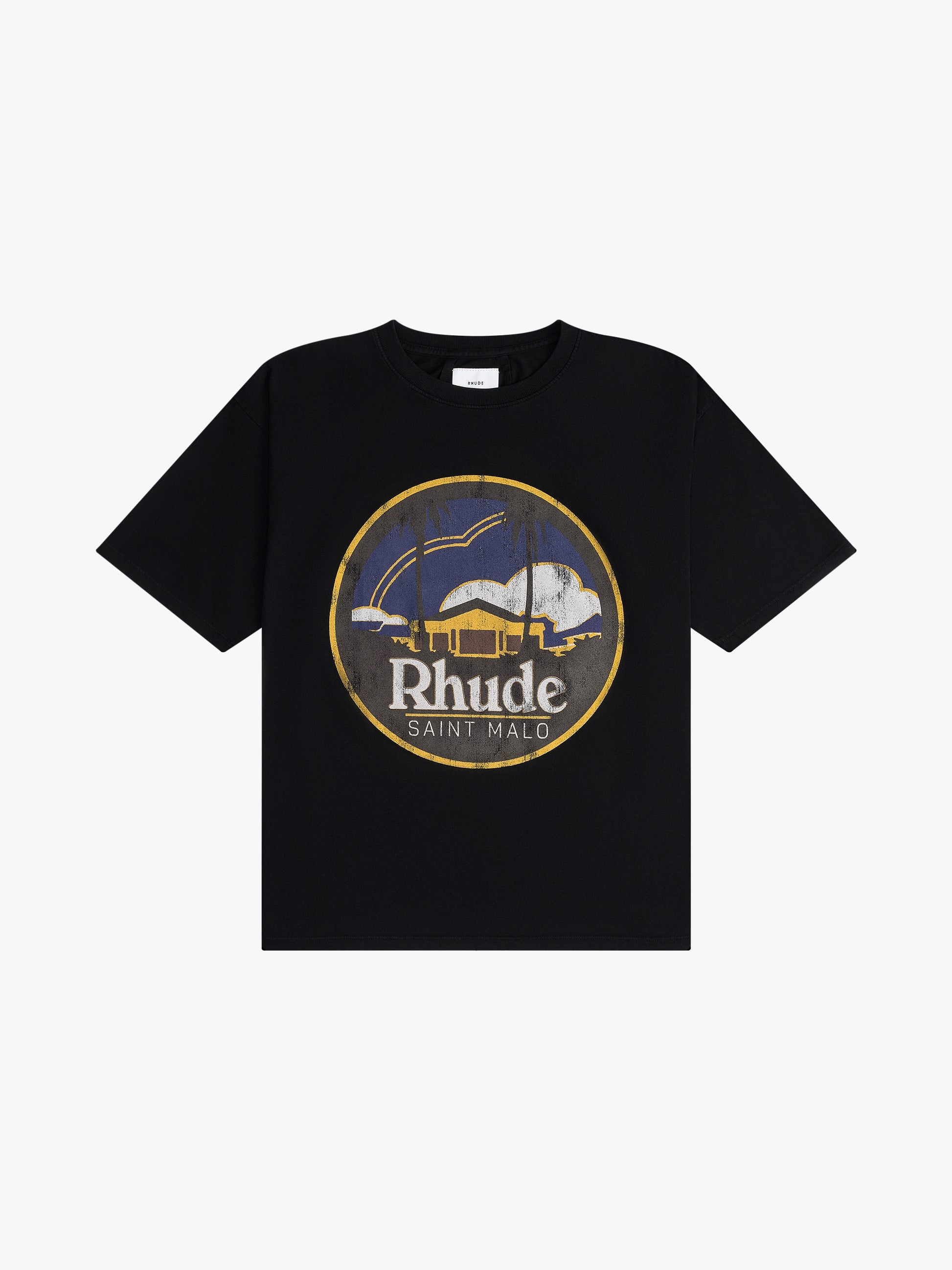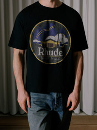 Custom-vintage fit cotton tee shirt with a ribbed neckline and short sleeves. Features RHUDE Saint Malo designs printed on front. CARE INSTRUCTIONS 100% COTTON DRY CLEAN ONLY WE RECOMMEND TAKING YOUR STANDARD SIZE