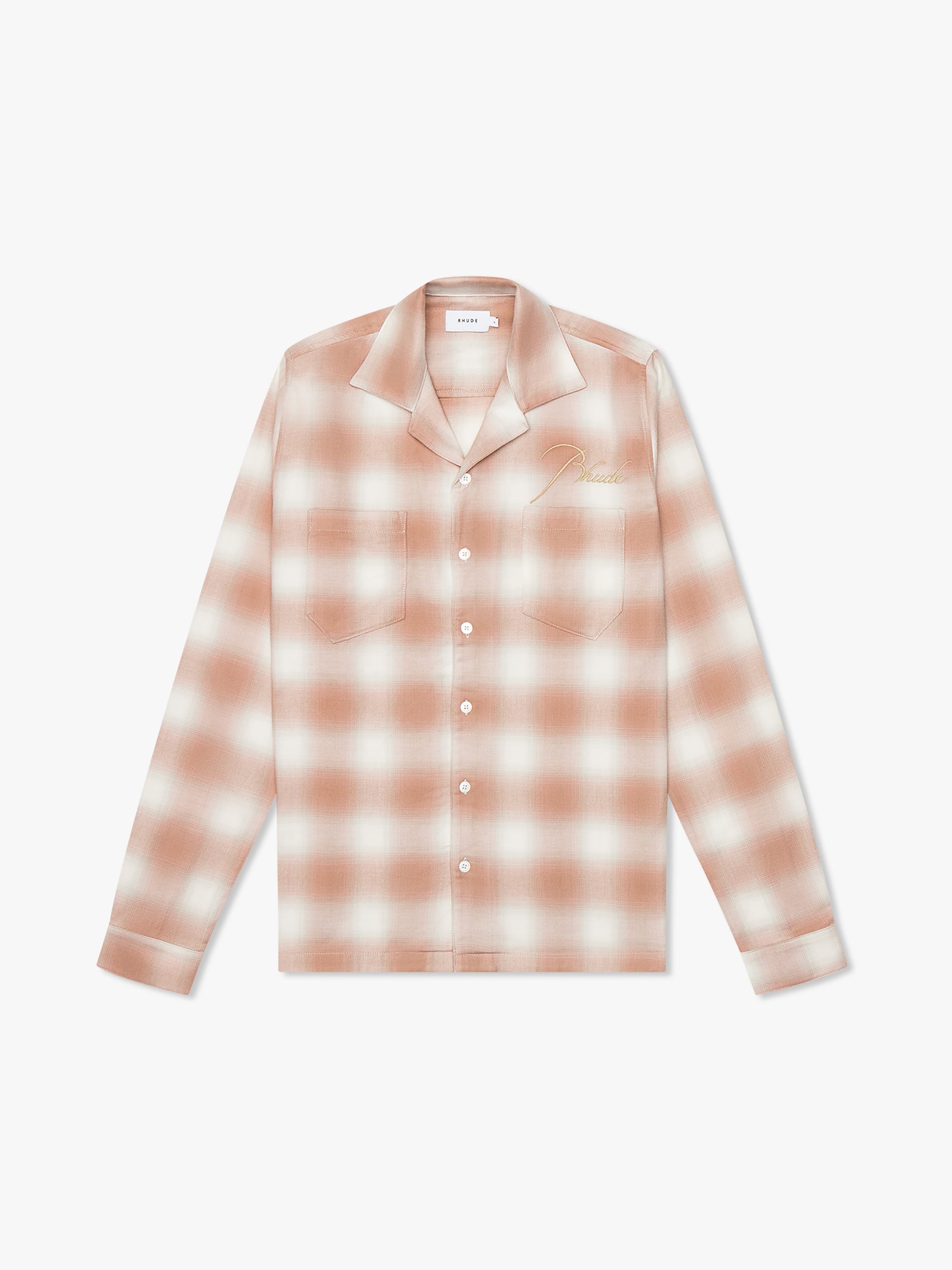 Premium long sleeve shirt crafted from high-quality, mid-weight flannel material. Features Rhude signature logo embroidered on front and back, a camp collar, dual front chest pockets, button down styling, and flat hem. CARE INSTRUCTIONS 100% COTTON DRY CLEAN ONLY. WE RECOMMEND TAKING YOUR STANDARD SIZE.