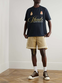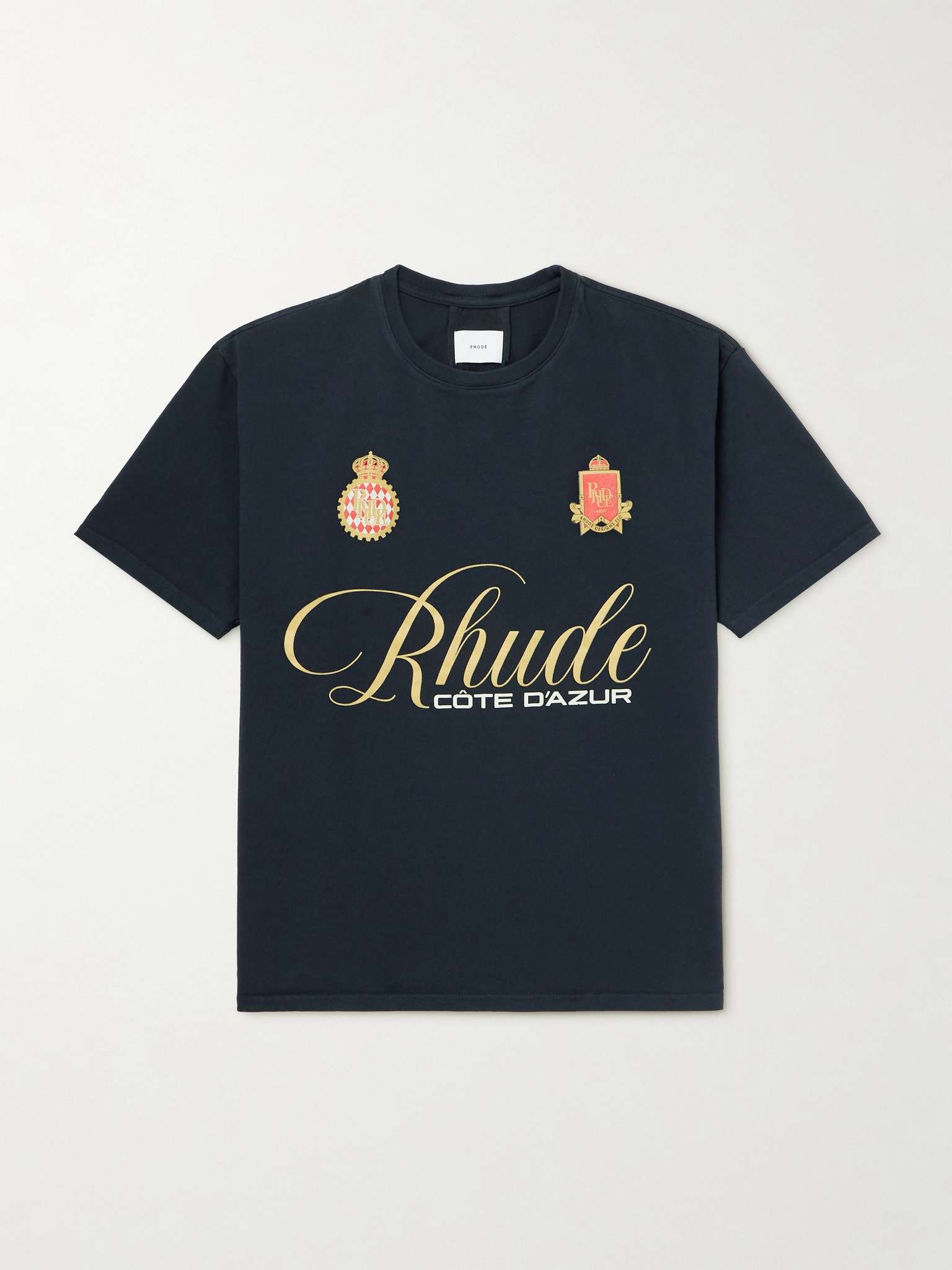 Rhude's Rhuigi Villasenor is also Chief Brand Officer of the Italian football club Como 1907. Taking cues from soccer kit, this T-shirt is printed with crests, alongside the brand name. Size & Fit - Fits true to size. Take your normal size - Designed for a loose fit - Lightweight, slightly stretchy fabric - Model is shown wearing a M - Model measures: waist size 32, height 6'2"/ 188cm Details & Care - Multicoloured cotton-jersey - 100% cotton - Machine wash