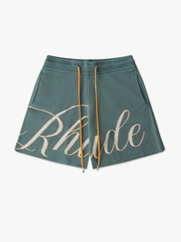 PREMIUM CASHMERE-SUPIMA COTTON BLEND SHORT WITH RHUDE SCRIPT LOGO ACROSS FRONT LEGS. FEATURING TWIN SIDE POCKETS, SINGLE BACK POCKET, AND EXTENDED DRAWSTRINGS IN OUR SIGNATURE MUSTARD TONE. CARE 85% SUPIMA COTTON 15% CASHMERE DRY CLEAN ONLY SIZING STANDARD FIT WE RECOMMEND TAKING YOUR STANDARD SIZE