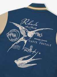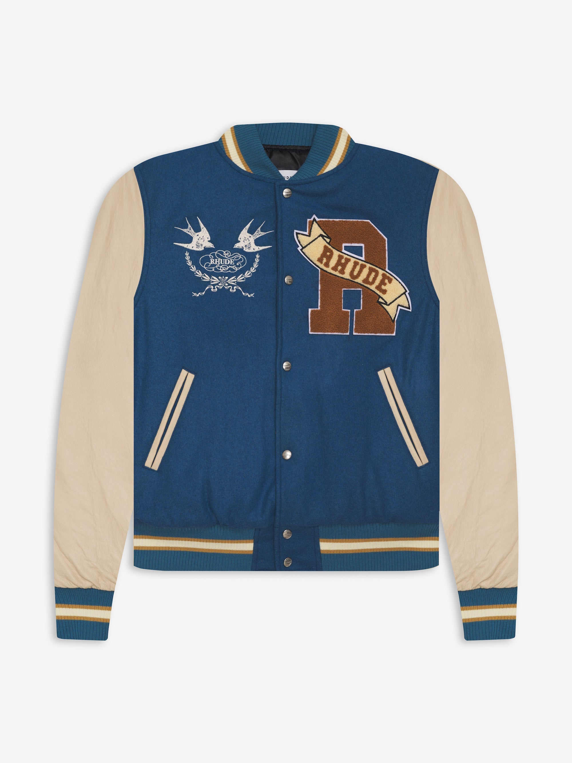 PREMIUM LEATHERVARSITY JACKET WITH A CROPPED HEM AND CUSTOM RHUDE RIRI SNAP CLOSURES. FEATURESRHUDE CHENILLE PATCH AT CHEST, SPARROW EMBROIDERED DETAILED DESIGNS THROUGHOUT FRONT AND BACK, A RIBBED COLLAR, WAIST AND CUFFS. CARE 75% WOOL 25% ACRYLIC/100% LEATHER/95% COTTON 5% SPANDEX WE RECOMMEND TAKING YOUR STANDARD SIZE DRY CLEAN ONLY