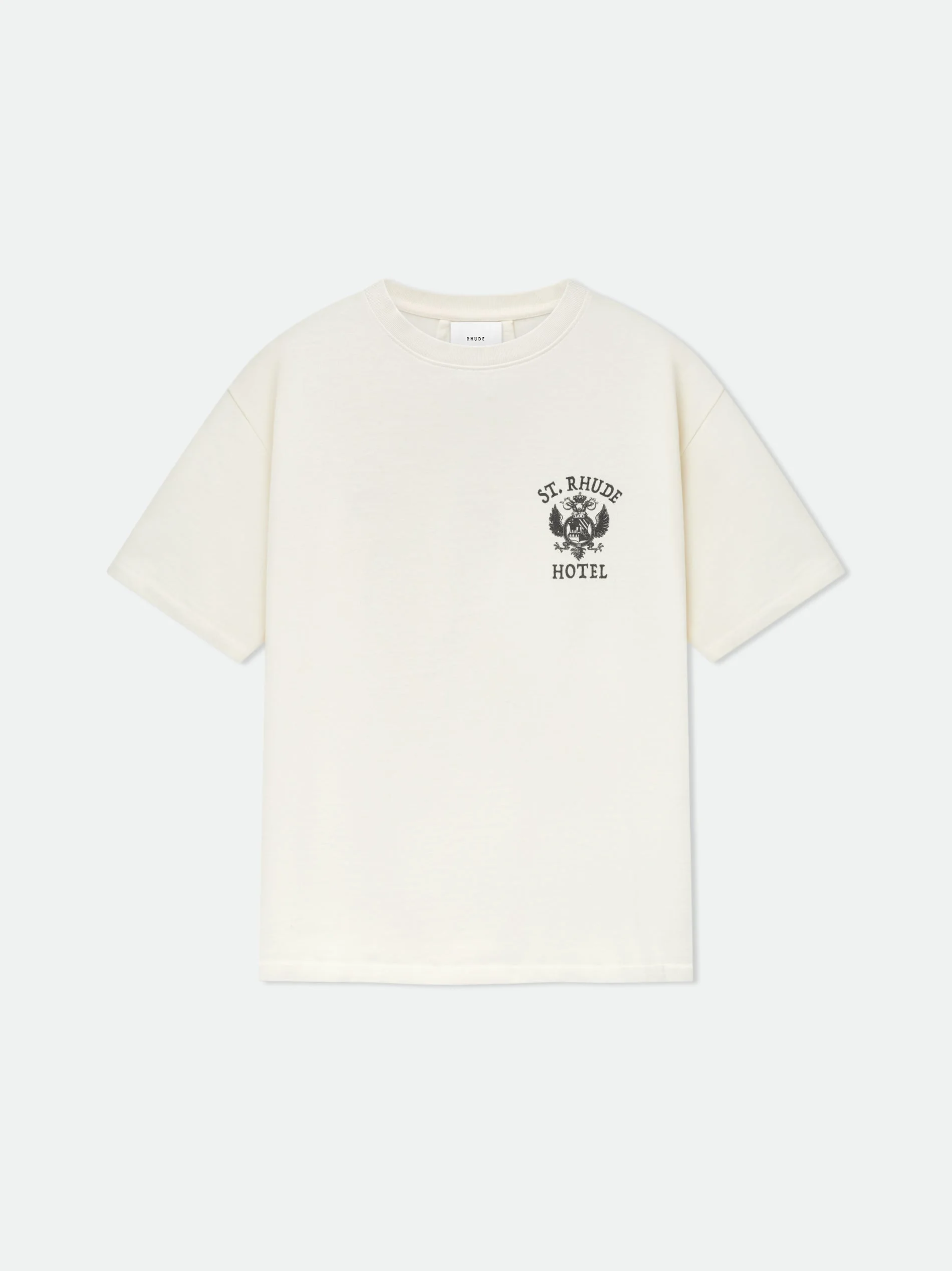 Custom-fit vintage wash cotton short sleeve tee-shirt with Rhude seal logo graphics graphics printed at front and back. 100% COTTON