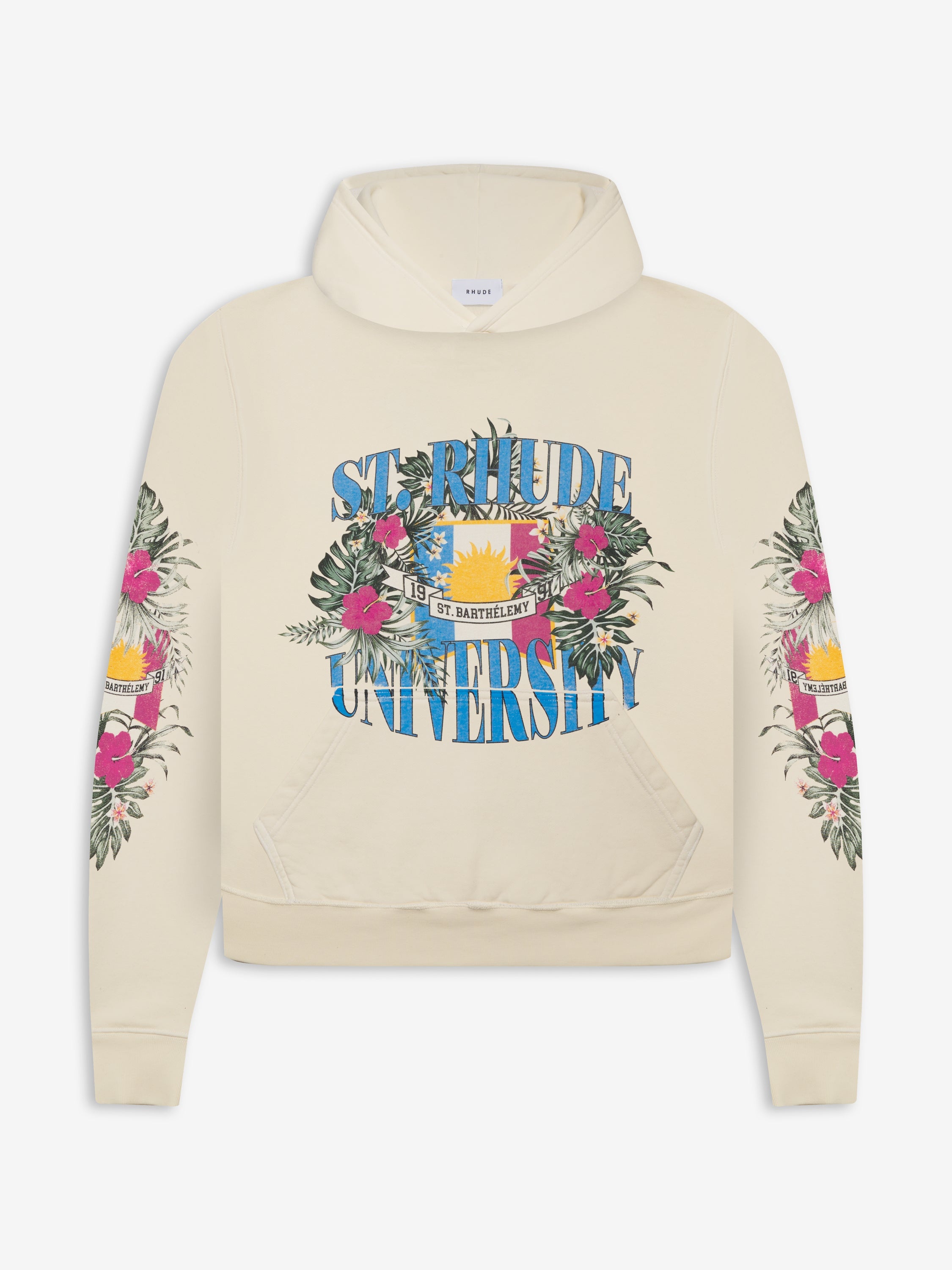 LONG SLEEVE FRENCH TERRY HOODIE WITH ST. RHUDE UNIVERSITY GRAPHICS PRINTED THE FRONT. FEATURING A KANGAROO FRONT POCKET AND DROPPED SHOULDERS.EACH PIECE IS UNIQUE AND PRINT DISTRESSING MY VARY PER STYLE. CARE 100% COTTON MACHINE WASH COLD STANDARD FIT.