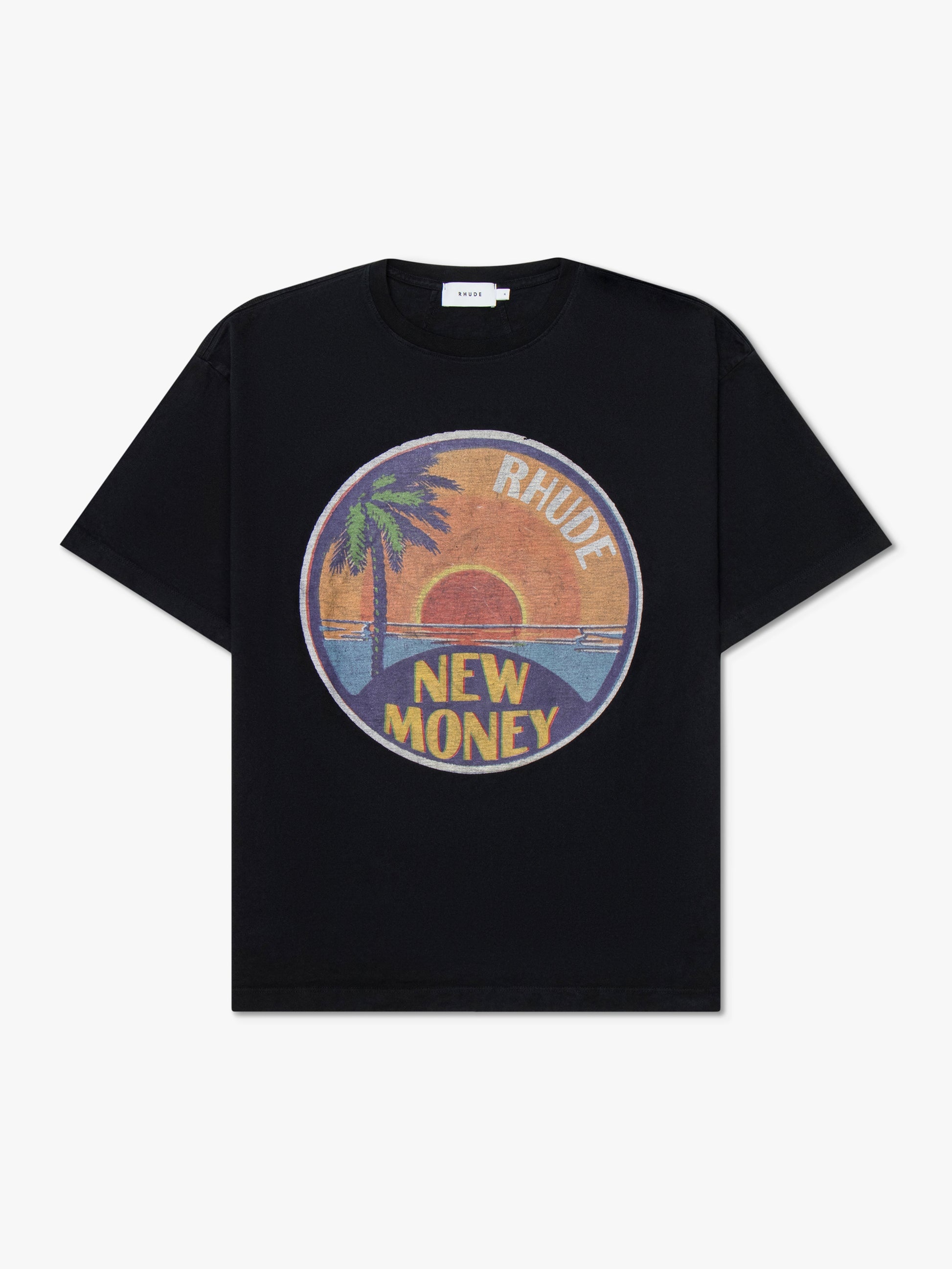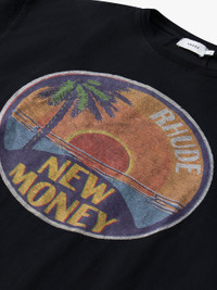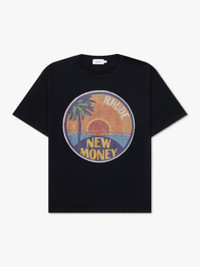 Custom-classic fit cotton tee shirt with a ribbed neckline and short sleeves. Features RHUDE New Money sunset graphics printed on front. CARE INSTRUCTIONS 100% COTTON DRY CLEAN ONLY WE RECOMMEND TAKING YOUR STANDARD SIZE
