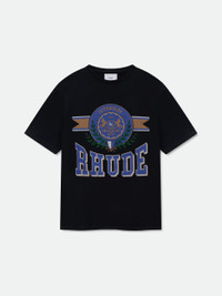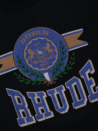 Custom-fit vintage wash cotton short sleeve tee-shirt with Rhude "Cotswold" university inspired graphics printed at front, with a clean back. 100% COTTON