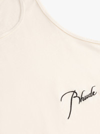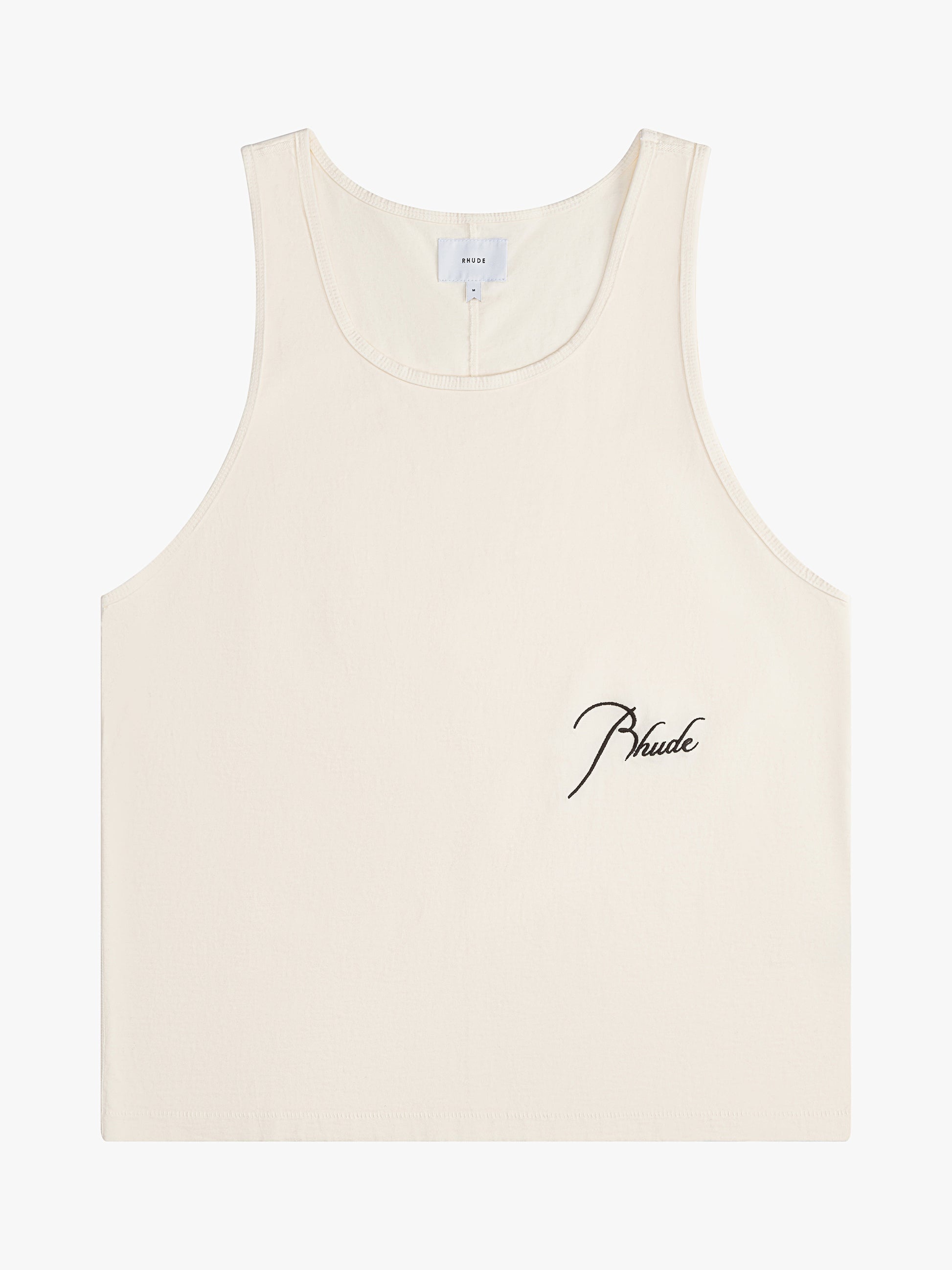Custom-fit vintage wash cotton tank top with Rhude signature logo embroidered at front. CARE INSTRUCTIONS 100% COTTON DRY CLEAN ONLY WE RECOMMEND TAKING YOUR STANDARD SIZE