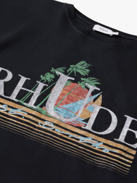 Custom-classic fit cotton tee shirt with a ribbed neckline and short sleeves. Features RHUDE St. Barts Tropical graphics printed on front. CARE INSTRUCTIONS 100% COTTON DRY CLEAN ONLY WE RECOMMEND TAKING YOUR STANDARD SIZE