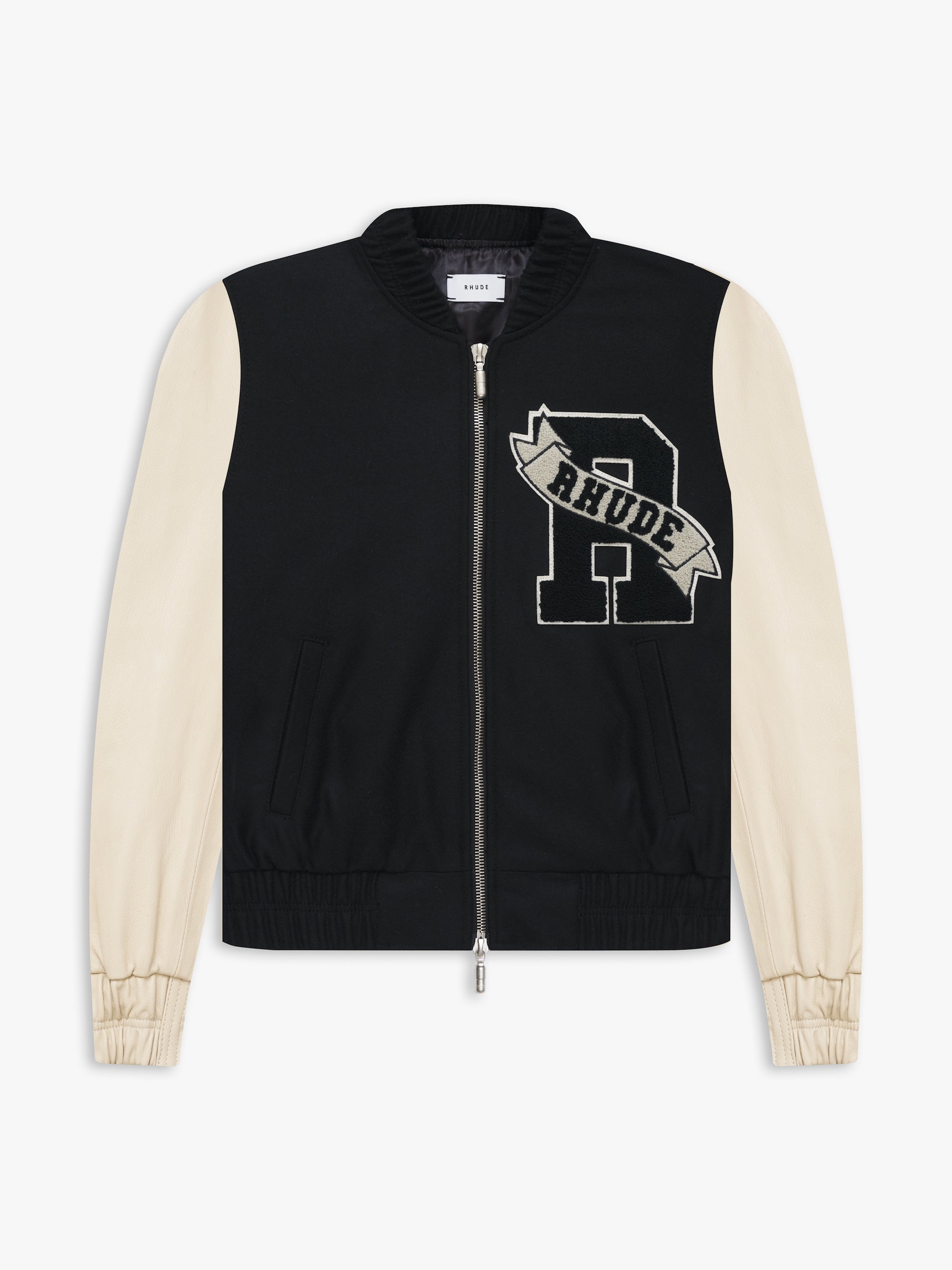 PREMIUM LEATHERVARSITY JACKET WITH A CROPPED HEM, TAILORED FIT, AND CUSTOM RHUDE ZIPPER HARDWARE - TWO WAY CLOSURE. FEATURES A RIBBED LEATHER WAIST AND CUFFS. CARE 80% LEATHER 20% ACETATE, 95% COTTON 5% SPANDEX/100% LEATHER/100%POLY DRY CLEAN ONLY. STANDARD FIT. WE RECOMMEND TAKING YOUR STANDARD SIZE.
