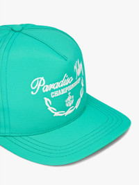 AW23 RUNWAY Heavyweight structured hat features Rhude Paradiso Valley Championship designs embroidered on the front. Features an adjustable strap at the back, so you can adjust the fit to your preference, and green under brim.