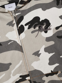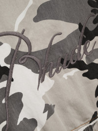 Premium washed camo workwear jacket features a hood and a versatile two-way zip closure. RHUDE logo is embroidered on the back. The elasticized hem and cuffs ensure a comfortable, secure fit. Fully lined for added warmth and structure, making it a stylish and functional piece. RHUDE WEBSITE EXCLUSIVE 100% COTTON