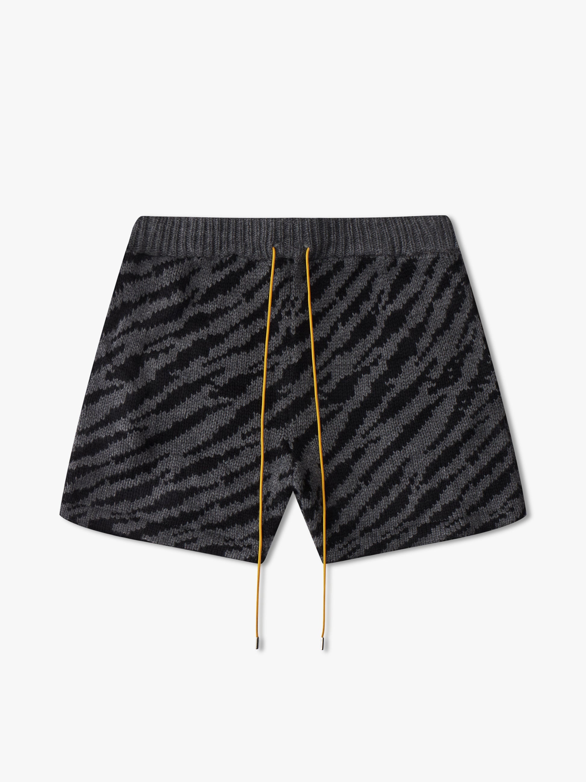 Premium cashmere-cotton blend short with an all over zebra design. Featuring twin side pockets, single back pocket, and extended drawstrings in our signature mustard tone. CARE INSTRUCTIONS 50% WOOL / 50% COTTON DRY CLEAN ONLY SIZING STANDARD FIT WE RECOMMEND TAKING YOUR STANDARD SIZE