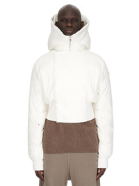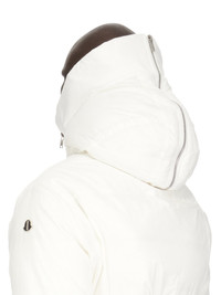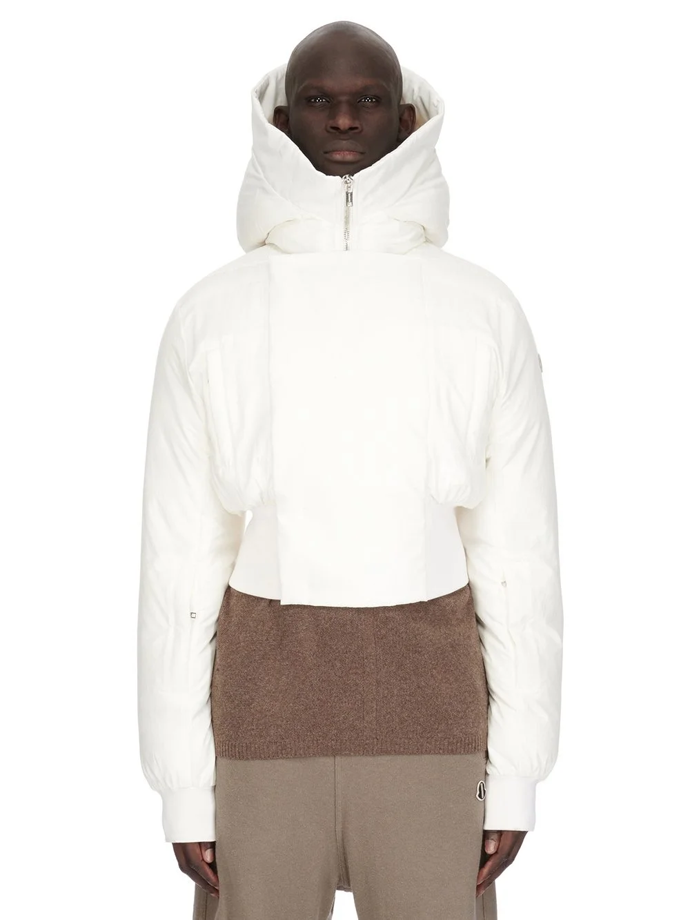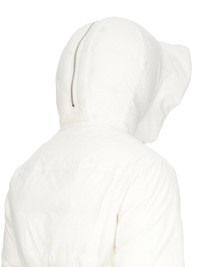 MONCLER + RICK OWENS FW24 ALICE PARKA IN MILK COTTON NYLON THIS ALICE PARKA IS ABOVE HIP LENGTH WITH LONG SLEEVES. IT HAS A CENTRE ZIPPER CLOSURE WHICH IS COVERED BY A WIDE DOUBLE-BREASTED FLAP THAT SECURES WITH CONCEALED SNAPS. WORN CLOSED IT CREATES A HIGH FUNNEL NECK. IT HAS A LARGE HOOD WITH A CENTRE ZIPPER THAT CAN BE WORN OPEN TO CREATE A LARGE COLLAR OVER THE SHOULDERS. IT HAS SIDE CHEST WELT POCKETS, TWO INTERNAL POCKETS WITH SNAPS AND A WIDE RIB WAISTBAND AND RIB CUFFS. IT HAS THE MONCLER + RICK OWENS EMBROIDERED LOGO PATCH ON THE UPPER LEFT ARM THIS LIGHTWEIGHT COTTON NYLON MATERIAL HAS A SOFT HAND FEEL. IT IS USED IN COMBINATION WITH A LONG HAIR CURLY GENUINE SHEARLING - COLOR: MILK - MATERIAL: 73% COTTON + 27% NYLON - PADDING 90% GOOSE DOWN + 10% GOOSE FEATHERS - INSERT 100% GOAT FUR - MALE MODEL IS 189 CM TALL, FEMALE MODEL IS 181 CM TALL - MALE MODEL IS WEARING SIZE 2, FEMALE MODEL IS WEARING SIZE 0
