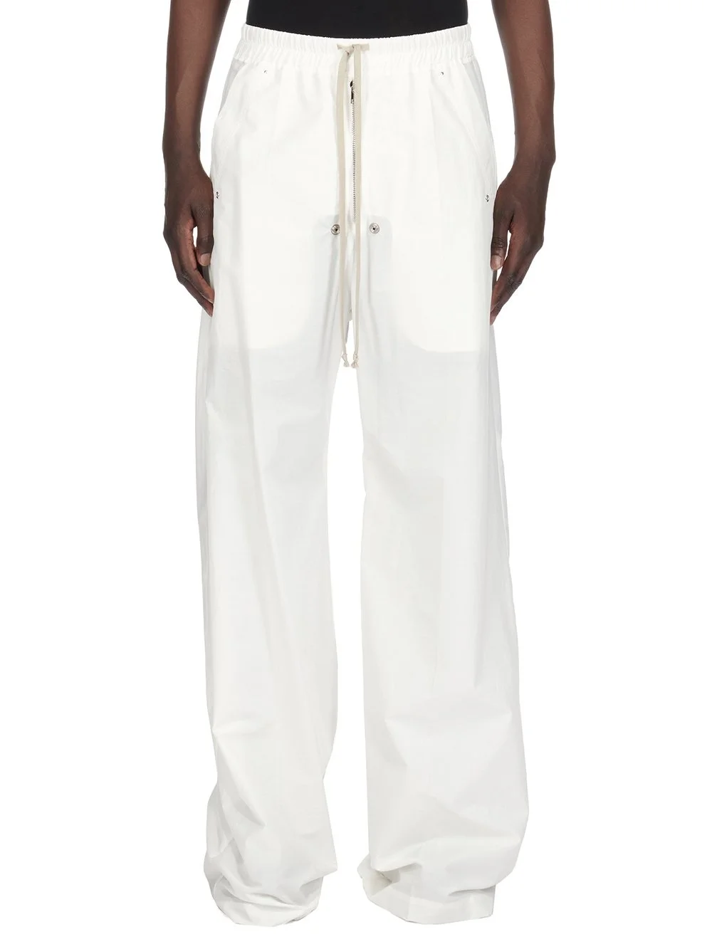 MONCLER + RICK OWENS FW24 WIDE BELA PANTS IN MILK COTTON NYLON THESE WIDE BELA PANTS ARE FULL-LENGTH WITH A LOW CROTCH AND A WIDE LEG. THEY FEATURE AN ELASTICIZED WAISTBAND WITH DRAWSTRING AND A BELA EXPOSED CENTRE ZIPPER WITH TWO SNAP DETAIL AT BOTTOM. THEY HAVE SIDE POCKETS WITH EYELET AND RIVET DETAIL AND BACK POCKETS WITH FLAPS. IT HAS THE MONCLER + RICK OWENS EMBROIDERED LOGO PATCH ON THE REAR LEFT HIP THIS LIGHTWEIGHT COTTON NYLON MATERIAL HAS A SOFT HAND FEEL - COLOR: MILK - MATERIAL: 73% COTTON + 27% NYLON - MALE MODEL IS 189 CM TALL, FEMALE MODEL IS 181 CM TALL - MALE MODEL IS WEARING SIZE M, FEMALE MODEL IS WEARING SIZE XS