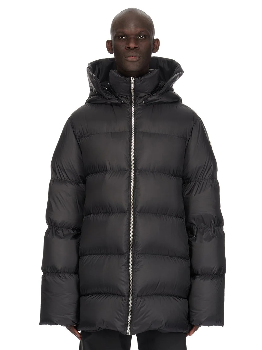 MONCLER + RICK OWENS FW24 HOODED CYCLOPIC COAT IN BLACK RECYCLED LONGUE SAISON THIS HOODED CYCLOPIC COAT IS MID-THIGH LENGTH WITH A CENTRE FRONT ZIPPER AND A HIGH TURTLE-NECK COLLAR. IT IS A PADDED DUVET QUILTED WITH HORIZONTAL STITCHING LINES AND HAS SIDE FRONT WELT POCKETS WITH SNAPS. IT HAS A LARGE HOOD WITH A CENTRE ZIPPER THAT CAN BE WORN OPEN TO CREATE A LARGE COLLAR OVER THE SHOULDERS. IT FEATURES A SIGNATURE COTTON WEBBING STRAP WITH RIVET DETAIL ON THE BACK YOKE. IT HAS TWO INSIDE POCKETS WITH SNAPS AND THE MONCLER + RICK OWENS EMBROIDERED LOGO PATCH ON THE UPPER LEFT ARM THIS AIRY AND LIGHTWEIGHT DUVET MATERIAL IS MADE USING CERTIFIED RECYCLED POLYESTER - COLOR: BLACK - MATERIAL: 100% POLYESTER - INSERT 50% NEW WOOL + 50% ACRYLIC - LINING 100% POLYESTER - PADDING 90% GOOSE DOWN + 10% GOOSE FEATHERS - MALE MODEL IS 189 CM TALL, FEMALE MODEL IS 181 CM TALL - MALE MODEL IS WEARING SIZE 2, FEMALE MODEL IS WEARING SIZE 0
