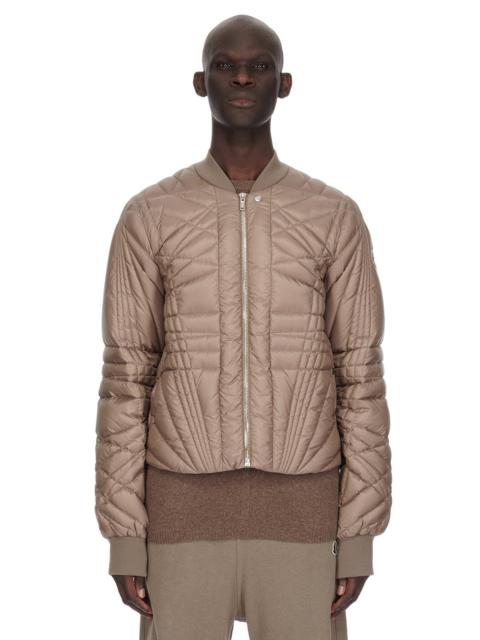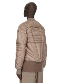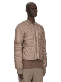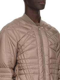MONCLER + RICK OWENS FW24 MEGAPENTA FLIGHT JKT IN DUST RECYCLED LONGUE SAISON WITH RADIANCE QUILTING THIS MEGAPENTA FLIGHT JKT IS ABOVE HIP LENGTH WITH LONG SLEEVES. IT HAS A CENTER FRONT ZIPPER WITH PLACKET AND TOP SNAP, SIDE WELT POCKETS WITH SNAPS, AND A RIBBED COLLAR, AND CUFFS. IT FEATURES THE SIGNATURE LEVEL SHOULDER SEAMS AND A COTTON WEBBING STRAP WITH RIVET DETAIL ON THE BACK YOKE. IT IS A DUVET JACKET THAT FEATURES THE MEGAPENTA QUILTING DESIGN, WITH LINES CRISS-CROSSING AROUND THE BODY, IN A LAYERED PENTAGRAM DESIGN. IT HAS THE MONCLER + RICK OWENS EMBROIDERED LOGO PATCH ON THE UPPER LEFT ARM THIS AIRY AND LIGHTWEIGHT DUVET MATERIAL IS MADE USING CERTIFIED RECYCLED POLYESTER - COLOR: DUST - MATERIAL: 100% POLYESTER - INSERT 46% ACRYLIC + 42% WOOL + 10% NYLON + 2% ELASTANE - LINING 100% POLYESTER - PADDING 90% GOOSE DOWN + 10% GOOSE FEATHERS - MALE MODEL IS 189 CM TALL, FEMALE MODEL IS 181 CM TALL - MALE MODEL IS WEARING SIZE 2, FEMALE MODEL IS WEARING SIZE 0
