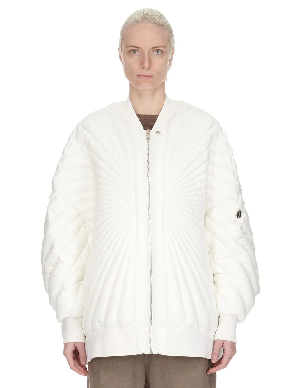 MONCLER + RICK OWENS FW24 RADIANCE PETER JKT IN MILK RECYCLED LONGUE SAISON WITH RADIANCE QUILTING THIS RADIANCE PETER JKT IS BELOW HIP LENGTH WITH A JUMBO OVERSIZED FIT. IT HAS A CENTRE FRONT ZIPPER WITH PLACKET AND TOP SNAP, LONG SLEEVES AND LOW SHOULDERS, WITH A DROPPED ARMHOLE AND LEVEL SHOULDER SEAMS. IT HAS A RIBBED COLLAR, CUFFS AND HEM AND POCKETS IN THE SIDE SEAM. IT IS A DUVET JACKET THAT FEATURES A RADIANCE QUILTING DESIGN, WITH LINES RADIATING FROM THE CENTRE FRONT BODY, TO WRAP AROUND AND FINISH AT CENTRE BACK. IT HAS THE MONCLER + RICK OWENS EMBROIDERED LOGO PATCH ON THE UPPER LEFT ARM THIS AIRY AND LIGHTWEIGHT DUVET MATERIAL IS MADE USING CERTIFIED RECYCLED POLYESTER - COLOR: MILK - MATERIAL: 100% POLYESTER - INSERT 46% ACRYLIC + 42% WOOL + 10% NYLON + 2% ELASTANE - LINING 100% POLYESTER - PADDING 90% GOOSE DOWN + 10% GOOSE FEATHERS - MALE MODEL IS 189 CM TALL, FEMALE MODEL IS 181 CM TALL - MALE MODEL IS WEARING SIZE 2, FEMALE MODEL IS WEARING SIZE 0