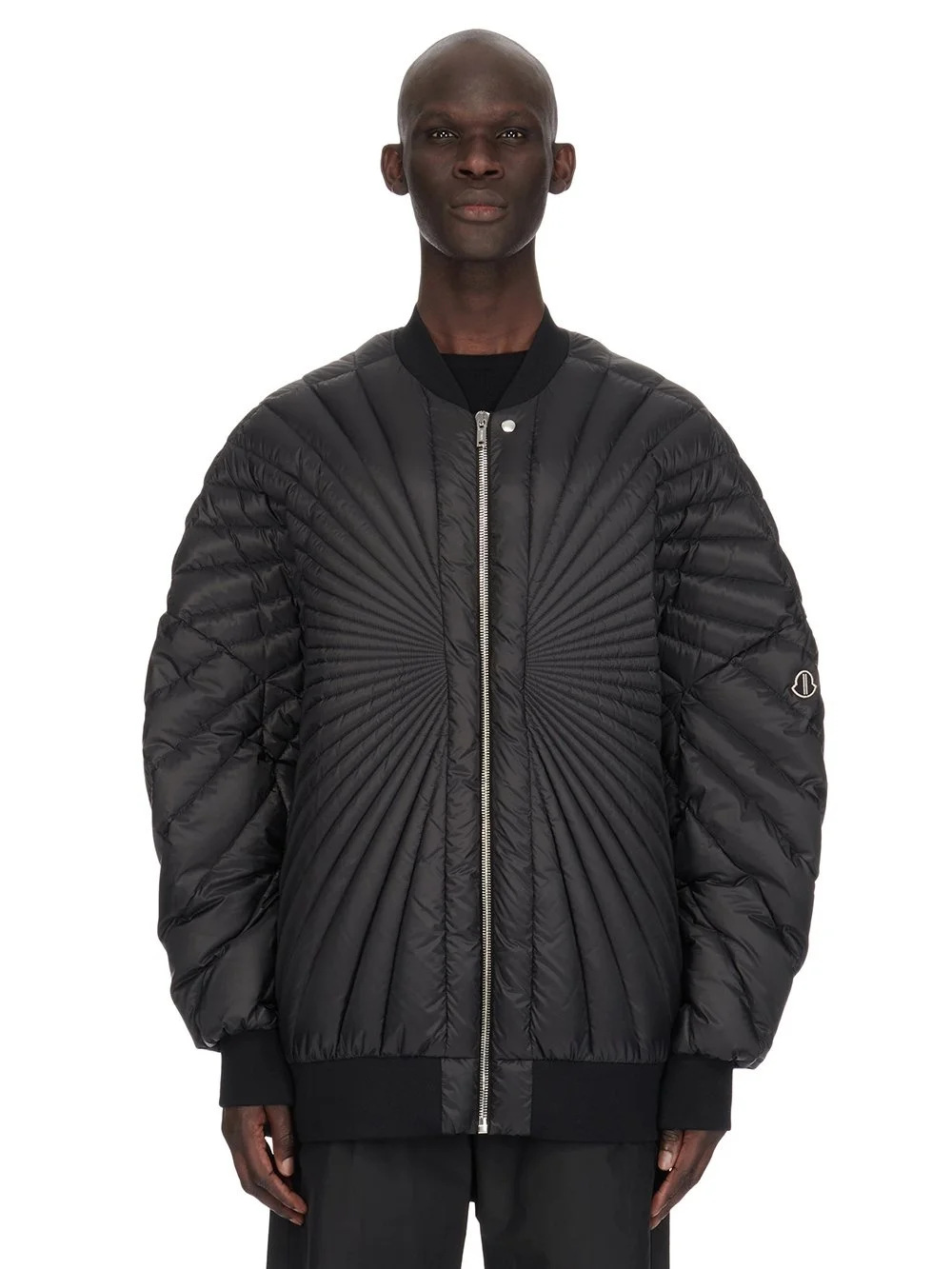 MONCLER + RICK OWENS FW24 RADIANCE PETER JKT IN BLACK RECYCLED LONGUE SAISON WITH RADIANCE QUILTING THIS RADIANCE PETER JKT IS BELOW HIP LENGTH WITH A JUMBO OVERSIZED FIT. IT HAS A CENTRE FRONT ZIPPER WITH PLACKET AND TOP SNAP, LONG SLEEVES AND LOW SHOULDERS, WITH A DROPPED ARMHOLE AND LEVEL SHOULDER SEAMS. IT HAS A RIBBED COLLAR, CUFFS AND HEM AND POCKETS IN THE SIDE SEAM. IT IS A DUVET JACKET THAT FEATURES A RADIANCE QUILTING DESIGN, WITH LINES RADIATING FROM THE CENTRE FRONT BODY, TO WRAP AROUND AND FINISH AT CENTRE BACK. IT HAS THE MONCLER + RICK OWENS EMBROIDERED LOGO PATCH ON THE UPPER LEFT ARM THIS AIRY AND LIGHTWEIGHT DUVET MATERIAL IS MADE USING CERTIFIED RECYCLED POLYESTER - COLOR: BLACK - MATERIAL: 100% POLYESTER - INSERT 46% ACRYLIC + 42% WOOL + 10% NYLON + 2% ELASTANE - LINING 100% POLYESTER - PADDING 90% GOOSE DOWN + 10% GOOSE FEATHERS - MALE MODEL IS 189 CM TALL, FEMALE MODEL IS 181 CM TALL - MALE MODEL IS WEARING SIZE 2, FEMALE MODEL IS WEARING SIZE 0