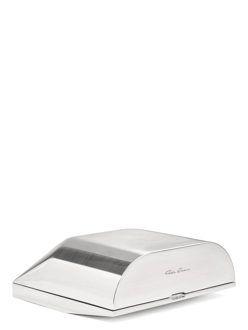 RICK OWENS FW25 CONCORDIANS LARGE PRONG CLUTCH IN PALLADIO THERMOPLASTIC AND PEACHED LEATHER THIS LARGE PRONG CLUTCH IS A HARD CASE METAL BAG WITH A FLAT BOTTOM AND ROUNDED SHAPE WITH BEVELED CORNERS. IT HAS A HINGE OPENING AND LEATHER INTERIOR. IT HAS THE RICK OWENS LOGO ENGRAVED ON TOP THIS A COMBINATION OF THERMOPLASTIC ABS AND PEACHED LEATHER THIS MATERIAL IS A HARD THERMOPLASTIC POLYMER CALLED ABS THE BRASSED BLACK FINISH IS OBTAINED BY REMOVING PARTS OF THE BLACK MATTE FINISH EXPOSING THE UNDERLAYING MATERIAL. THIS MADE WITH THE INDIVIDUAL HANDWORK OF THE ARTISAN WHICH MEANS EACH PIECE IS UNIQUE COLOR: PALLADIO MATERIAL: 100% POLIMERO TERMOPLASTICO LINING 100% LAMB LEATHER IT MEASURES 30CM X 17CM X 7,5CM