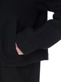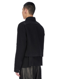 RICK OWENS FW25 CONCORDIANS ALICE BRAD IN BLACK BOILED WOOL THIS ALICE BRAD JACKET IS ABOVE HIP LENGTH WITH A STRAIGHT FIT AND LONG SLEEVES. IT HAS A CENTRE FRONT ZIPPER OPENING, CLASSIC COLLAR, DIAGONAL SIDE FRONT WELT POCKETS WITH AN INTERNAL SNAP, SNAP CUFFS AND DOUBLE TOPSTITCHING. IT FEATURES A CONCEALED ZIPPERED POCKET IN THE LEFT FOREARM, SIGNATURE LEVEL SHOULDER SEAMS AND A COTTON WEBBING STRAP WITH RIVET DETAIL ON THE BACK YOKE. IT IS FULLY LINED WITH TWO INTERNAL ZIPPERED POCKETS THIS FABRIC IS MADE FROM RWS CERTIFIED VIRGIN WOOL WHICH ENSURES A HIGH STANDARD IN ANIMAL WELFARE, ENVIRONMENTAL SUSTAINABILITY AND SOCIAL RESPONSIBILITY. EACH BALE OF WOOL IS TRACEABLE BACK TO ITS SOURCE COLOR: BLACK MATERIAL: 100% NEW WOOL BODY AND POCKETS LINING 100% COTTON SLEEVES LINING 100% CUPRO MODEL IS 189CM TALL MODEL WEARS SIZE 48