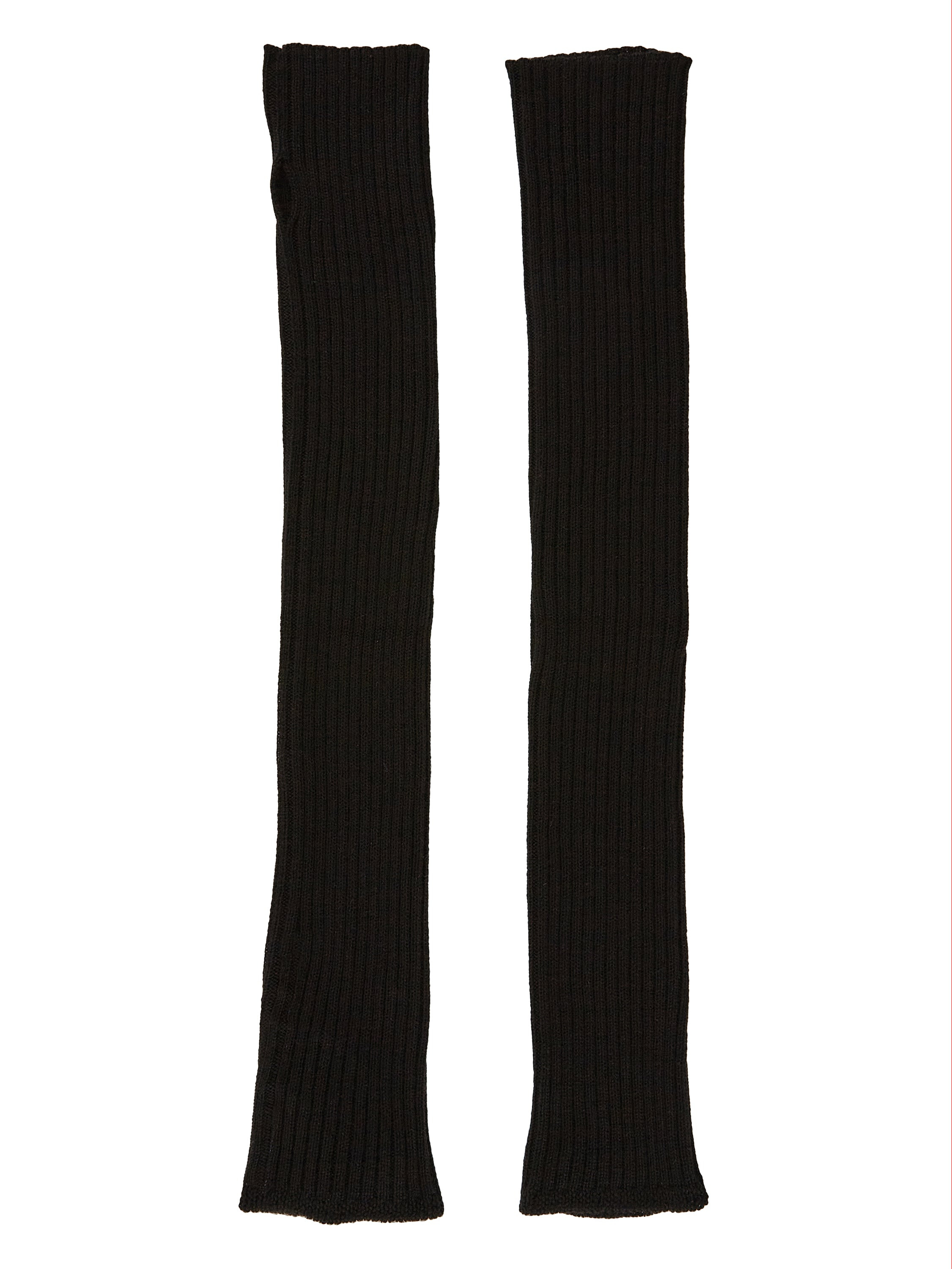RICK OWENS SS26 TEMPLE ARM WARMERS IN BLACK LIGHTWEIGHT RASATO KNIT THESE ARM WARMERS ARE LONG, TUBE-SHAPE, GLOVES WITHOUT HANDS. THEY FEATURE A HOLE FOR THE THUMB AND A VISIBLE SILVER SNAP TO ATTACH THE PAIR TOGETHER. THIS LIGHTWEIGHT AND CLASSIC STITCH WOOL KNIT HAS A SOFT HANDFEEL. COLOR: BLACK MATERIAL:100% NEW WOOL MODEL IS 189CM TALL ITEM IS AVAILABLE IN ONE SIZE