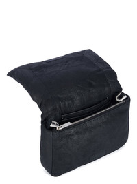 RICK OWENS SS25 HOLLYWOOD PILLOW GRIFFIN IN BLACK BLISTER LAMB LEATHER THIS PILLOW GRIFFIN IS A SMALL RECTANGULAR, SOFT PADDED BAG, WITH A FRONT FLAP, WITH A PALLADIUM INDENTED EASY-GRIP BEVEL AND MAGNETIC CLOSURE. IT HAS ONE PONTICELLO D-LOOP ON FRONT, AN INNER POCKET WITH 9 CARD SLOTS AND A SECOND INNER ZIPPERED POCKET. IT FEATURES A LONG THIN LEATHER STRAP WITH A PALLADIUM TONE BRASS HOOK WHICH TIES ON ONE SIDE, OR CAN BE DETACHED TO CREATE A CLUTCH THIS LIGHTWEIGHT LAMB LEATHER HAS AN EXAGGERATED UNEVEN BLISTERED TEXTURE AND A SOFT, FLUID HANDFEEL. THE BLISTERED TEXTURE IS ACHIEVED BY EXAGGERATING THE NATURAL GRAIN TEXTURE OF EACH SKIN, THEREFORE THE LOOK OF EACH SKIN IS UNIQUE. THIS LEATHER IS MADE BY A THIRD GENERATION FAMILY OWNED TANNERY IN THE SOUTH OF ITALY. COLOR: BLACK MATERIAL: 100% LAMB LEATHER PADDING 90% POLYESTER + + 10% ACRYLIC WIDTH 22,5CM / HEIGHT 13CM / DEPTH 5CM