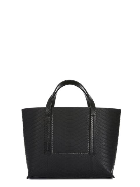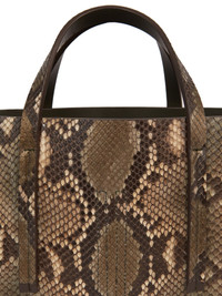 RICK OWENS FW25 CONCORDIANS MINI SHOPPER IN BOSCO PYTHON LEATHER THIS MINI SHOPPER IS A HORIZONTAL RECTANGULAR BAG WITH TWO SHORT CARRY HANDLES AND AN OPEN TOP. IT HAS AN INNER ZIPPERED POCKET AND A INNER FLAT POCKET WITH SIGNATURE U-SHAPED STITCHING DETAIL VISIBLE ON THE FRONT. IT IS EMBOSSED WITH THE RICK OWENS LOGO THIS GENUINE PYTHON SNAKESKIN HAS A WAXY AND SOFT HAND FEEL. IT IS COLORED IN A DIAMOND PATTERN FOLLOWING THE NATURAL SCALES OF THE PYTHON. EACH STEP OF THE COLORING PROCESS IS EXECUTED BY HAND PYTHON IS PROTECTED BY THE CITIES AGREEMENT AND REGULATIONS, WHICH MEANS EACH SKIN CAN BE TRACED BACK TO ITS ORIGIN THIS TANNERY IS LWG CERTIFIED WITH A SILVER RATING COLOR: BOSCO MATERIAL: 100% PYTHON LEATHER LINING 100% LAMB LEATHER IT MEASURES 32,5CM X 19,5CM X 10CM