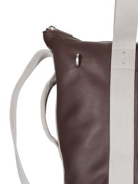 RICK OWENS SS25 HOLLYWOOD TROLLEY IN MAHOGANY/OYSTER SOFT GRAIN COW LEATHER THIS TROLLEY BAG IS A LARGE RECTANGULAR SHAPED BODY WITH A TOP ZIPPER AND AN INNER ZIPPERED POCKET WITH SIGNATURE U-SHAPED STITCHING DETAIL VISIBLE ON THE FRONT IT FEATURES COTTON WEBBING STRAPS WITH RIVET DETAIL, INCLUDING TWO HAND CARRY STRAPS, A LONGER, ADJUSTABLE, SHOULDER STRAP, A SIDE HANDLE SO THE BAG CAN BE CARRIED VERTICALLY, AND A WIDE STRAP ON THE BACK, DESIGNED TO SLIDE OVER THE HANDLE OF YOUR SUITCASE FOR PRACTICAL CARRYING THIS MEDIUMWEIGHT COW LEATHER HAS A SUBTLE GRAIN TEXTURE AND NATURAL HANDFEEL. TANNED IN THE VENETO AREA OF ITALY, THIS LEATHER IS TUMBLED MULTIPLE TIMES IN A LARGE DRUM IN ORDER TO BRING OUT THE NATURAL GRAIN TEXTURE OF THE SKIN. THE LEATHER IS FINISHED WITH ANILINE AND AIR-DRIED IN ORDER TO ACHIEVE THE NATURAL AND WAXY HANDFEEL. THIS TANNERY IS LWG CERTIFIED WITH A SILVER RATING. COLOR: MAHOGANY/OYSTER MATERIAL: 100% CALF LEATHER RIBBONS 100% COTTON WIDTH 51CM / HEIGHT 34CM / DEPTH 15CM