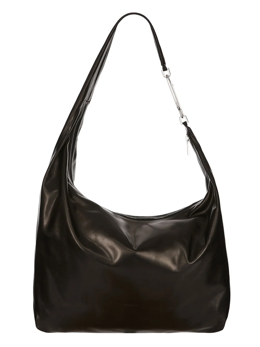 RICK OWENS FW25 CONCORDIANS GEMINI BAG IN BLACK GLOSSY BUTTER CALF LEATHER THIS GEMINI BAG IS A LARGE SOFT A-SHAPED BAG THAT SLOUCHES IN THE MIDDLE. IT CURVES OVER TO CREATE A STRAP THAT SECURES WITH A GEMINI DOUBLE ENDED SNAP HOOK ENGRAVED WITH THE RICK OWENS LOGO. THE BAG OPENS WITH A TOP ZIP, HAS AN INNER POUCH POCKET AND A FLAT POCKET WITH SIGNATURE U-SHAPED STITCHING DETAIL VISIBLE ON THE REAR EXTERIOR THIS LIGHTWEIGHT GLOSSY BUTTER FULL CALF LEATHER IS FINISHED USING ANALINE AND NATURAL OILS IN ORDER TO ACHIEVE ITS BUTTERY HANDFEEL IT IS FINISHED BY HOT PRESS IN ORDER TO ACHIEVE THE SHINY SURFACE COLOR: BLACK MATERIAL: 100% CALF LEATHER IT MEASURES 54CM X 38CM X 12CM