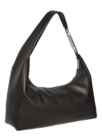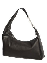 RICK OWENS SS26 TEMPLE CROPPED GEMINI BAG IN BLACK GRAINY COW LEATHER THIS CROPPED GEMINI BAG IS A SMALL SOFT A-SHAPED BAG THAT SLOUCHES IN THE MIDDLE. IT CURVES OVER TO CREATE A STRAP THAT SECURES WITH A GEMINI DOUBLE-ENDED SNAP HOOK ENGRAVED WITH THE RICK OWENS LOGO. THE BAG OPENS WITH A TOP ZIPPER, HAS AN INNER POUCH POCKET, AND A FLAT POCKET WITH SIGNATURE U-SHAPED STITCHING DETAIL VISIBLE ON THE REAR EXTERIOR THIS MEDIUMWEIGHT COW LEATHER HAS A SUBTLE GRAIN TEXTURE AND NATURAL HANDFEEL TANNED IN THE VENETO AREA OF ITALY, THIS LEATHER IS TUMBLED MULTIPLE TIMES IN A LARGE DRUM IN ORDER TO BRING OUT THE NATURAL GRAIN TEXTURE OF THE SKIN. THE LEATHER IS FINISHED WITH ANILINE AND AIR-DRYED IN ORDER TO ACHIEVE THE NATURAL AND WAXY HANDFEEL THIS TANNERY IS LWG CERTIFIED WITH A SILVER RATING COLOR: BLACK MATERIAL:100% CALF LEATHER WIDTH 46CM HEIGHT 22CM DEPTH 12CM