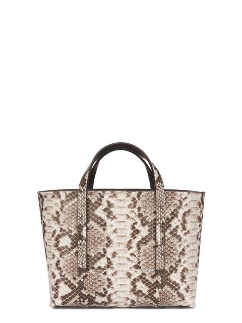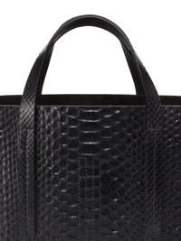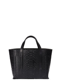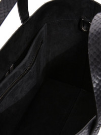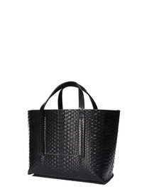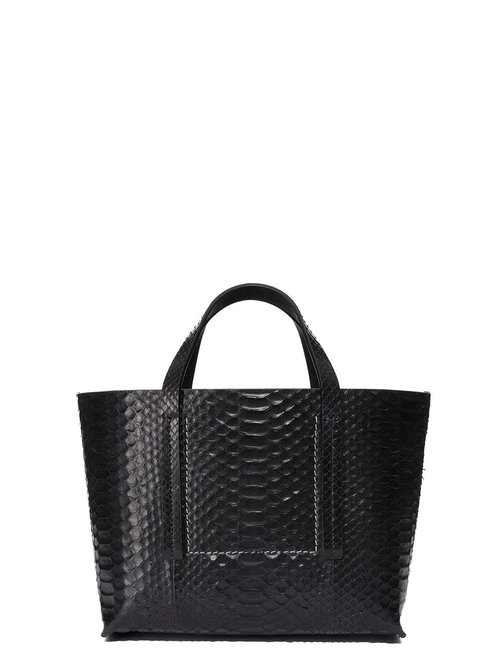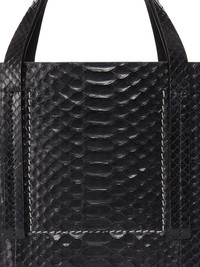 RICK OWENS EXCLUSIVE MINI SHOPPER IN BLACK PYTHON SNAKESKIN THIS EXCLUSIVE MINI SHOPPER IS A HORIZONTAL RECTANGULAR BAG WITH TWO SHORT CARRY HANDLES AND AN OPEN TOP. IT HAS AN INNER ZIPPERED POCKET AND AN INNER FLAT POCKET WITH SIGNATURE U-SHAPED STITCHING DETAIL VISIBLE ON THE FRONT. IT IS EMBOSSED WITH THE RICK OWENS LOGO THIS GENUINE PYTHON SNAKESKIN HAS A WAXY AND SOFT HAND FEEL. IT IS COLORED IN A BLACK DIAMOND PATTERN FOLLOWING THE NATURAL SCALES OF THE PYTHON. EACH STEP OF THE COLORING PROCESS IS EXECUTED BY HAND PYTHON IS PROTECTED BY THE CITIES AGREEMENT AND REGULATIONS, WHICH MEANS EACH SKIN CAN BE TRACED BACK TO ITS ORIGIN THIS TANNERY IS LWG CERTIFIED WITH A SILVER RATING COLOR: BLACK MATERIAL: 100% PYTHON LEATHER LINING 100% LAMB LEATHER WIDTH 32,5CM / HEIGHT 19,5CM / DEPTH 10CM