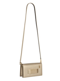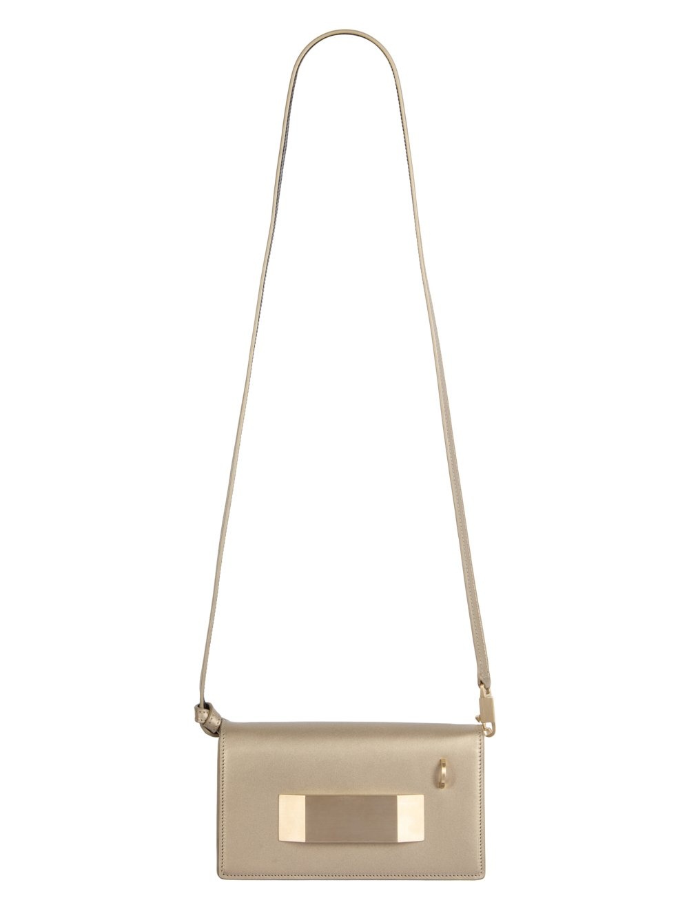 RICK OWENS SS25 HOLLYWOOD GRIFFIN IN GOLD METALLIC SPALLA THIS GRIFFIN IS A SMALL RECTANGULAR BAG WITH A FRONT FLAP WITH A PALLADIUM INDENTED EASY-GRIP BEVEL AND MAGNETIC CLOSURE. IT HAS ONE PONTICELLO D-LOOP ON FRONT, AN INNER POCKET WITH 9 CARD SLOTS AND A SECOND INNER ZIPPERED POCKET. IT FEATURES A LONG THIN LEATHER STRAP WITH A PALLADIUM TONE BRASS HOOK WHICH TIES ON ONE SIDE, OR CAN BE DETACHED TO CREATE A CLUTCH THIS HEAVYWEIGHT COW LEATHER IS VEG TANNED AND HAS A METALLIC GOLD FINISH. VEG TANNING MEANS ONLY VEGETAL AND NATURAL TANNINS WERE USED IN THE PROCESS OF TANNING AND PRESERVING THIS LEATHER. COLOR: GOLD MATERIAL: 100% COW LEATHER WIDTH 21,5CM / HEIGHT 13CM / DEPTH 4,5CM