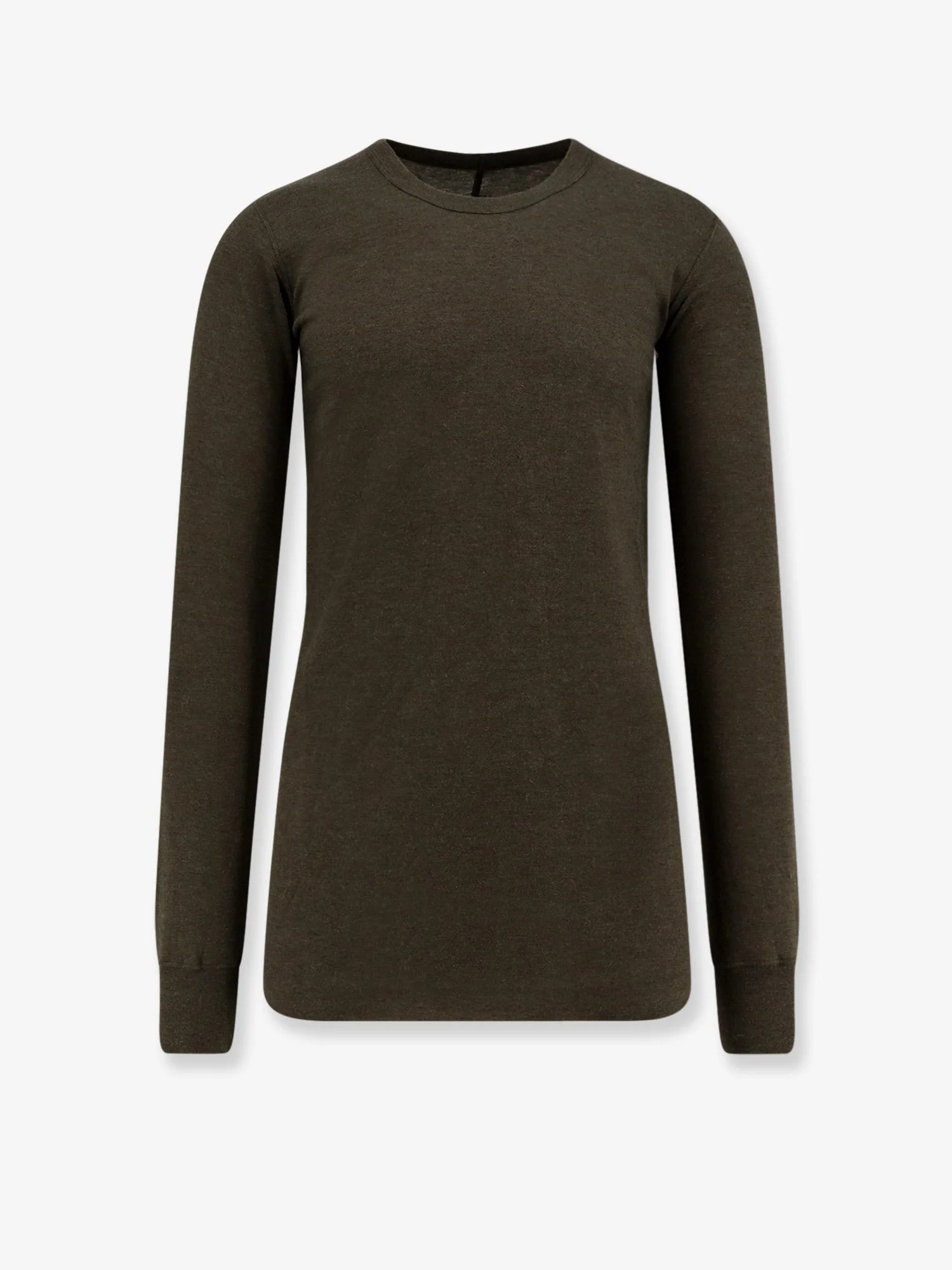 Brand: RICK OWENS Product reference: RU02E1252 Color reference: JR25 Color: Green Season: 25A Gender: Man Category 1: Abbigliamento Category 2: T-Shirts and Top Made in: ITALIA Ribbed crew-neck Long sleeves with cuffs Raw hem Made in Italy 30% polyamide, 30% viscose, 20% angora, 20% wool SKU: RU02E1252JR25