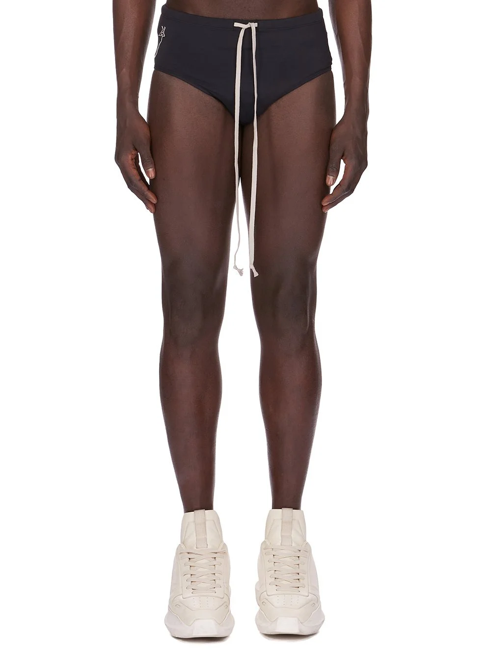 CHAMPION X RICK OWENS SS25 SWIM BRIEF IN BLACK SWIM JERSEY THEY HAVE A SMALL CHAMPION X RICK OWENS PENTAGRAM LOGO PATCH ON RIGHT THIGH. THIS MEDIUMWEIGHT CLASSIC SWIMWEAR JERSEY HAS COMFORT STRETCH, A MATTE FINISH AND IS PRODUCED ESPECIALLY FOR SWIMWEAR WITH HIGH UV AND CHLORINE RESISTANCE. THIS JERSEY IS MADE USING CERTIFIED RECYCLED POLYAMIDE WHICH ENSURES A REDUCTION IN WATER CONSUMPTION, EMISSIONS AND HAZARDOUS WASTE, LESSENING THE DEPENDENCE ON NON-RENEWABLE RESOURCES. COLOR: BLACK MATERIAL: 80% POLYAMIDE 20% ELASTANE MODEL WEARS SIZE M MODEL IS 189CM TALL