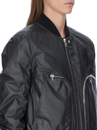RICK OWENS FW25 CONCORDIANS BAUHAUS FLIGHT IN BLACK COATED POPLIN THIS BAUHAUS FLIGHT IS HIP LENGTH WITH LONG SLEEVES. IT HAS A CENTER FRONT ZIPPER WITH PLACKET AND TOP SNAP, LEVEL SHOULDER SEAMS, A BACK YOKE AND RIBBED COLLAR, CUFFS AND HEM. IT FEATURES SIDE SEAM POCKETS, OVERLAYED WITH TWO SIGNATURE ROUNDED BAUHAUS ZIPPERED POCKETS. IT IS FULLY LINED AND HAS TWO INTERNAL ZIPPERED POCKETS THIS LIGHTWEIGHT COTTON POPLIN HAS A SEMI SHINY WATER REPELLENT WAX COATING AND A CRISPY HAND FEEL THIS FABRIC IS MADE USING GOTS CERTIFIED ORGANIC COTTON WHICH MEANS THE NATURAL FIBER IS GROWN WITHOUT HARMFUL CHEMICALS, LEAVING OUR SOIL, AIR AND WATER CLEANER FROM CONTAMINATES COLOR: BLACK MATERIAL: 93% COTTON + 7% POLYURETHANE KNIT RIB CUFFS AND BOTTOM 94% NEW WOOL + 5% NYLON + 1% ELASTANE MODEL IS 189CM TALL MODEL WEARS SIZE 48