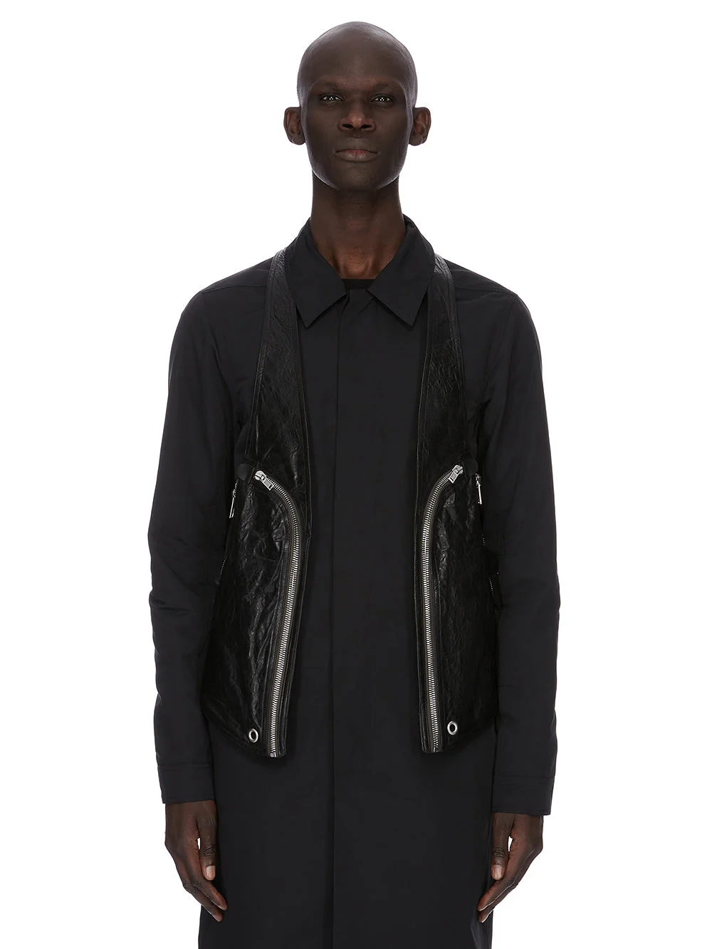 RICK OWENS SS26 TEMPLE BAUHAUS VEST IN BLACK TUMBLED LAMB THIS BAUHAUS VEST FEATURES TWO FRONT ROUNDED BAUHAUS ZIP POCKETS WITH ADDITIONAL SIDE ZIPPERED POCKETS. ITS SLIM BODY WITH STRAPS SLIPS OVER THE SHOULDERS, AND HAS A HARNESS BACK WITH SECTION OF COTTON WEBBING BETWEEN THE SHOULDER BLADES. IT FEATURES ROUND SILVER EYELETS AND TOPSTITCHING. THIS MEDIUMWEIGHT LAMB LEATHER IS VEG TANNED AND FINISHED WITH ANILINE. THE SURFACE TEXTURE, WHICH IS THE NATURAL GRAIN OF THE SKIN, IS ACHIEVED BY TUMBLING THE SKINS FOR 15 HOURS IN A WOODEN DRUM. VEG TANNING MEANS ONLY VEGETAL AND NATURAL TANNINS WERE USED IN THE PROCESS OF TANNING AND PRESERVING THIS LEATHER. THIS TANNERY IS LWG AUDITED. COLOR: BLACK MATERIAL:100% LAMB LEATHER POCKETS TONGUE 100% COW LEATHER BODY LINING 97% COTTON + 3% ELASTANE POCKETS LINING 100% COTTON MODEL IS 189CM TALL MODEL WEARS SIZE 48
