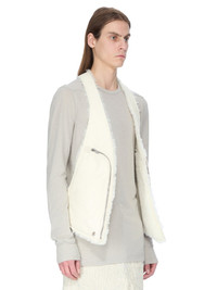 RICK OWENS FW25 CONCORDIANS BAUHAUS VEST IN MILK ALBINO SHEARLING THIS BAUHAUS VEST FEATURES TWO FRONT ROUNDED BAUHAUS ZIP POCKETS WITH ADDITIONAL SIDE ZIPPERED POCKETS. ITS SLIM BODY WITH STRAPS SLIPS OVER THE SHOULDERS, AND HAS A HARNESS BACK WITH SECTION OF COTTON WEBBING BETWEEN THE SHOULDER BLADES. IT FEATURES ROUND SILVER EYELETS AND TOPSTITCHING THIS HEAVYWEIGHT SHEARLING LAMB LEATHER HAS A SEMI SHINY, WAXY NAPPA FINISH AND A SOFT NATURAL LENGTH FUR TANNED IN THE TUSCANY AREA OF ITALY USING A METAL FREE TANNING PROCESS, THESE SHEARLING MERINO HIDES ARE OF SPANISH ORIGIN, THE UNIQUE THICK FUR OF THESE ANIMALS MAKE THEM PERFECT FOR SHEARLING. BECAUSE THE HAIR IS NATURAL, THERE WILL BE VARIATIONS IN HAIR LENGTH AND TEXTURE, MAKING EACH PIECE UNIQUE THIS TANNERY IS LWG CERTIFIED WITH A SILVER RATING COLOR: MILK MATERIAL: 100% LAMB SHEARLING REAL FUR POCKETS TONGUE 100% COW LEATHER POCKETS LINING 100% COTTON MODEL IS 189CM TALL MODEL WEARS SIZE 48