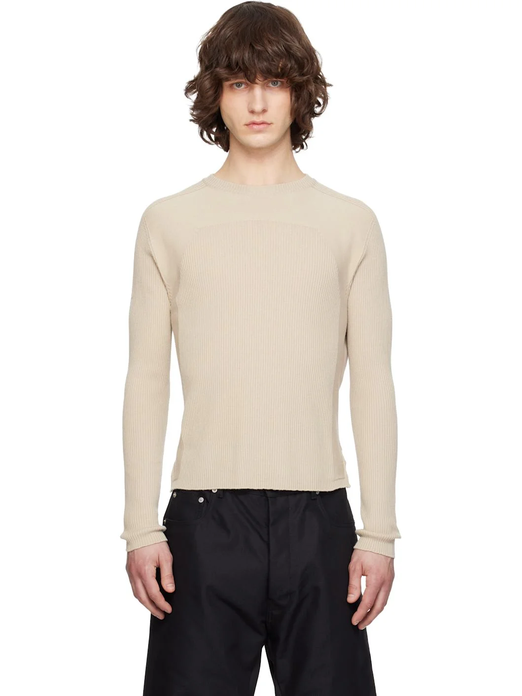 Rib-knit virgin wool sweater. · Crewneck · Tennis-tail hem · Modified saddle shoulders · Central garter-stitch stripe at back Supplier color: Sand 100% virgin wool. Made in Italy 261232M201012