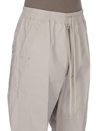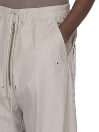 RICK OWENS SS26 TEMPLE BELA PANTS IN PEARL HEAVY POPLIN THESE BELA PANTS ARE FULL LENGTH WITH A LOOSE FIT AND A DROPPED CROTCH. THEY HAVE AN ELASTICIZED WAISTBAND WITH DRAWSTRING, A BELA FLY WITH EXPOSED CENTER ZIPPER AND SNAP DETAIL AT BOTTOM, SIDE WELT POCKETS WITH EYELET AND RIVET DETAIL AND BACK POCKETS WITH FLAPS AND SNAPS. THIS MEDIUMWEIGHT COTTON POPLIN HAS A CRISP HANDFEEL AND WASHED FINISH. THIS FABRIC IS MADE USING GOTS CERTIFIED ORGANIC COTTON WHICH MEANS THE NATURAL FIBRE IS GROWN WITHOUT HARMFUL CHEMICALS, LEAVING OUR SOIL, AIR AND WATER CLEANER FROM CONTAMINATES. COLOR: PEARL MATERIAL:97% COTTON + 3% ELASTANE MODEL IS 189CM TALL MODEL WEARS SIZE 48