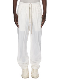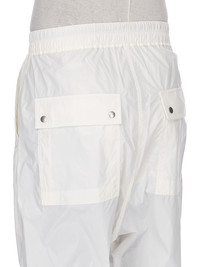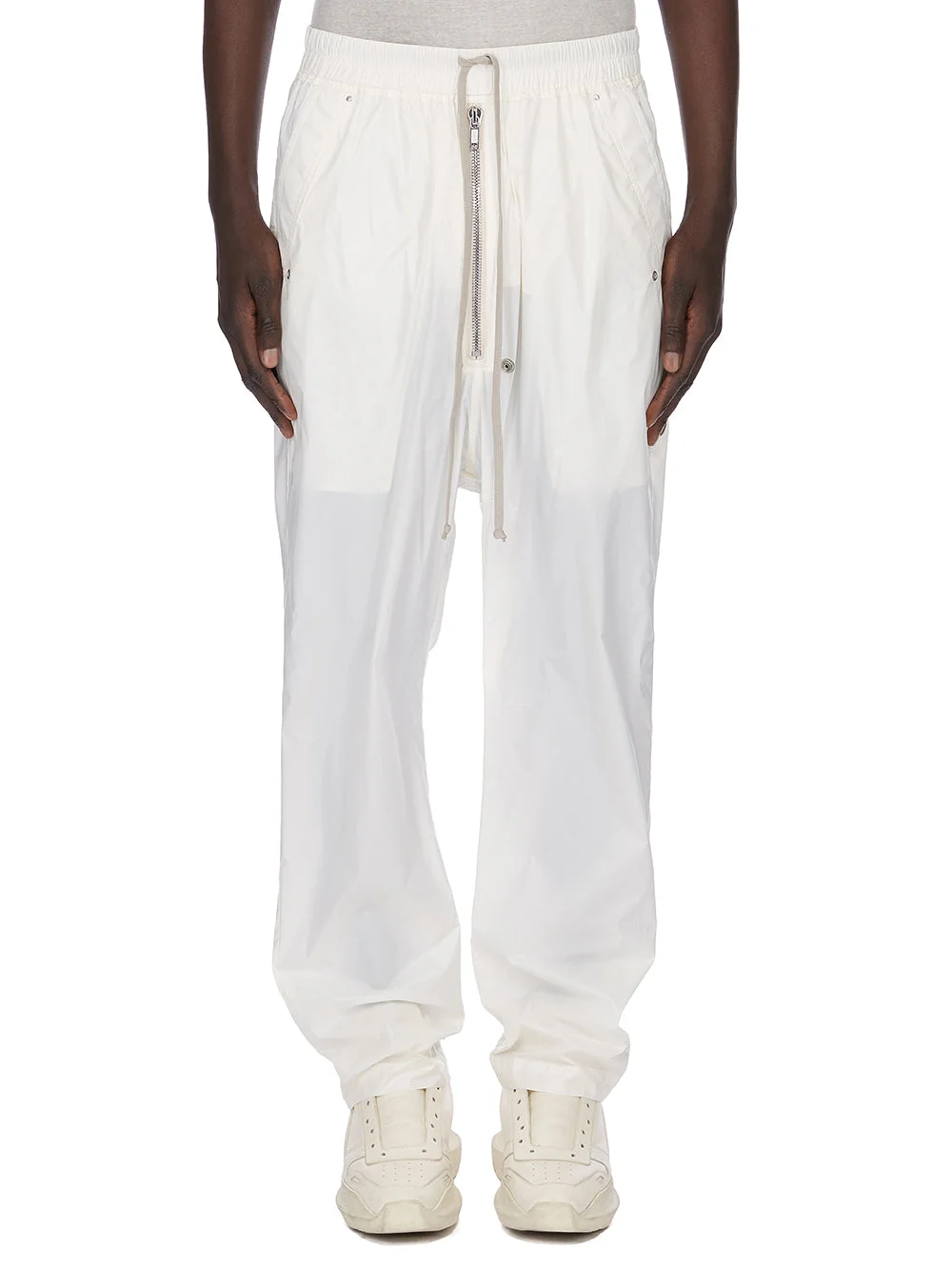 RICK OWENS SS26 TEMPLE BELA PANTS IN MILK SHINY NYLON THESE BELA PANTS ARE FULL LENGTH WITH A LOOSE FIT AND A DROPPED CROTCH. THEY HAVE AN ELASTICIZED WAISTBAND WITH DRAWSTRING, A BELA FLY WITH EXPOSED CENTER ZIPPER AND SNAP DETAIL AT BOTTOM, SIDE WELT POCKETS WITH EYELET AND RIVET DETAIL AND BACK POCKETS WITH FLAPS AND SNAPS. THIS AIRY AND LIGHTWEIGHT NYLON IS MADE USING GRS CERTIFIED RECYCLED NYLON WHICH ENSURES A REDUCTION IN WATER CONSUMPTION, EMISSIONS AND HAZARDOUS WASTE, LESSENING THE DEPENDENCE ON NON-RENEWABLE RESOURCES. COLOR: MILK MATERIAL:100% NYLON MODEL IS 189CM TALL MODEL WEARS SIZE 48