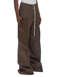 RICK OWENS FW24 PORTERVILLE RUNWAY WIDE BELA PANTS IN ASH/BROWN/BLACK COTTON WHIPCORD, LODEN FELT AND RECYCLED TYRE THESE WIDE BELA PANTS ARE FULL-LENGTH PANTS WITH A LOW CROTCH AND WIDE LEG WITH CREASES IN THE FRONT AND BACK LEG. THEY FEATURE AN ELASTICIZED WAISTBAND DRAWSTRING AND A BELA EXPOSED CENTRE ZIPPER WITH TWO SNAP DETAIL AT BOTTOM. THEY HAVE SIDE POCKETS WITH EYELET AND RIVET DETAIL AND BACK POCKETS WITH FLAPS AND SNAP CLOSURES THIS IS A COMBINATION OF COTTON WHIPCORD, LODEN FELT AND RECYCLED TYRE. THIS MEDIUM WEIGHT COTTON WHIPCORD HAS A VISIBLE TWILL STRUCTURE AND A DRY HANDFEEL. IT IS MADE USING RAW COTTON YARNS MEANING IRREGULAR SLUBS ARE VISIBLE THROUGHOUT THE WEAVE. THE FABRIC HAS MINIMAL FINISHING IN ORDER TO KEEP THE NATURAL CHARACTERISTICS OF THE COTTON YARN. THIS FABRIC WAS WOVEN ON A 1950’S VINTAGE SHUTTLE LOOM BY BONOTTO, A 4TH GENERATION TEXTILE MILL FOUNDED IN 1912 SITUATED JUST BELOW THE PREALPS IN VENETO, ITALY. - COLOR: ASH/BROWN/BLACK - MATERIAL: 100% COTTON - EXTERNAL POCKETS 100% NEW WOOL - LEFT LEG DETAIL 100% NATURAL RUBBER - MODEL IS 189CM TALL - MODEL WEARS SIZE 48