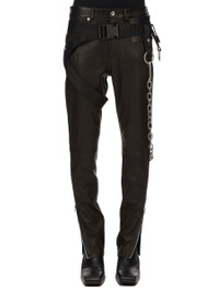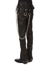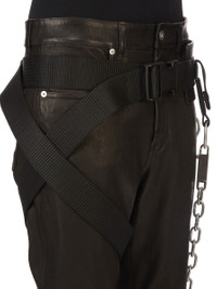 RICK OWENS SS26 TEMPLE BELT IN BLACK GROPPONE COW LEATHER THIS BELT IS A WIDE LEATHER STRAP WITH A CENTRAL PALS WEBBING STRAP WITH QUICK RELEASE BUCKLE, CHAIN WITH CLIPS ON EITHER END AND THREE, REMOVABLE, HANGING ""O"" RINGS. OTHER ACCESSORIES IN THE COLLECTION CAN BE HUNG FROM THE BELT. THIS HEAVYWEIGHT COW GROPPONE LEATHER IS VEG TANNED AND FINISHED USING NATURAL WAXES. BECAUSE THIS SKIN IS NAKED, NOT FINISHED USING ANY PIGMENTS COVERING THE SKIN, NATURAL MARKINGS AND SHADINGS ARE VISIBLE WHICH MAKES EACH SKIN AND PRODUCT UNIQUE. VEG TANNING MEANS ONLY VEGETAL AND NATURAL TANNINS WERE USED IN THE PROCESS OF TANNING AND PRESERVING THIS LEATHER. THIS TANNERY IS LWG CERTIFIED WITH A GOLD RATING. THIS ITEM IS PART OF THE RICK OWENS COLLABORATION WITH NEW YORK PUNK DUO SUICIDEBANDOFFICIAL AND FEATURES A SIGNATURE LABEL ON THE INTERIOR. THE BAND PIONEERED THE USE OF MINIMALIST ELECTRONIC INSTRUMENTATION DURING THE 1970S. THE RAW, DISTURBING SOUND AND THREATENING, CHAOTIC LIVE SHOWS OF VOCALIST ALAN VEGA AND MUSICIAN MARTIN REV WERE MET WITH HOSTILITY EARLY ON — THEY WERE CONSIDERED OUTSIDERS AMONG THEIR CONTEMPORARIES AND LARGELY VILIFIED, BUT THEIR INFLUENCE HAS BEEN SIGNIFICANT IN THE DECADES SINCE. I USED THEIR SONG CHEREE FOR ONE OF MY FIRST RUNWAY SHOWS AND NOW I HAVE DEVELOPED A CAPSULE COLLECTION WITH THE SUPPORT OF THE BAND, REFERENCING THEIR DESTROYED, DECONSTRUCTED LEATHERS, TAILORED JKTS, AND ATHLETIC TRACK TOPS. COLOR: BLACK MATERIAL: 52% POLYESTER + 48% COTTON KNIT RIB COLLAR, WRIST BAND AND BOTTOM 97% POLYESTER + 3% ELASTANE THIS ITEM IS AVAILABLE IN ONE SIZE
