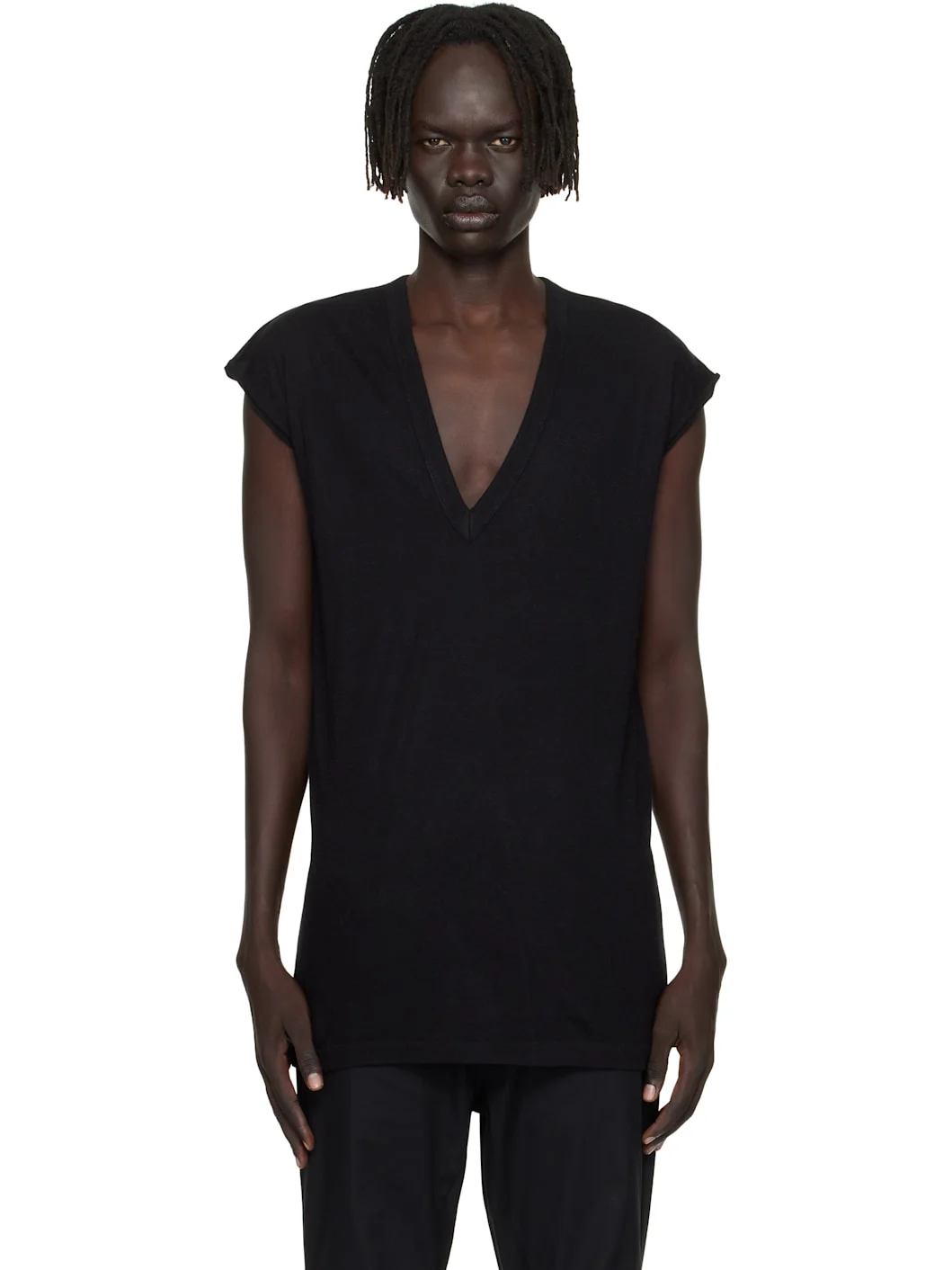 Nylon- and viscose-blend jersey T-shirt. · FSC®- and RWS-certified · Rib-knit plunging V-neck · Raw edge at cap sleeves · Central seam at back Supplier color: Black 30% polyamide, 30% viscose, 20% angora, 20% wool. Made in Italy 252232M213081