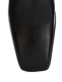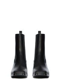 RICK OWENS FW25 CONCORDIANS HEELED SLIVER IN BLACK WASHED CALF THESE HEELED SLIVER BOOTS ARE ABOVE-ANKLE HEIGHT. THEY HAVE A SQUARE TOE AND SLANTING CUBAN HEEL, SIDE GEOMETRIC SIDE PANELS IN STRETCH ELASTIC, AN ANGULAR HEEL COUNTER WITH TOP STITCHING AND A BACK LOOP PULL TAB. THIS MEDIUMWEIGHT COW LEATHER IS VEG TANNED AND FINISHED USING NATURAL WAXES. A FINAL WASH GIVES THIS LEATHER ITS SOFTNESS AND BRINGS OUT THE NATURAL GRAIN TEXTURE OF EACH SKIN. BECAUSE THIS SKIN IS NAKED, NOT FINISHED USING ANY PIGMENTS COVERING THE SKIN, NATURAL MARKINGS AND SHADINGS ARE VISIBLE WHICH MAKES EACH SKIN AND PRODUCT UNIQUE. VEG TANNING MEANS ONLY VEGETAL AND NATURAL TANNINS WERE USED IN THE PROCESS OF TANNING AND PRESERVING THIS LEATHER. COLOR: BLACK MATERIAL: UPPER 100% CALF LEATHER LINING 100% CALF LEATHER INSOLE 100% CALF LEATHER SOLE 100% COW LEATHER SOLE DETAIL 100% THERMOPLASTIC POLYURETHANE