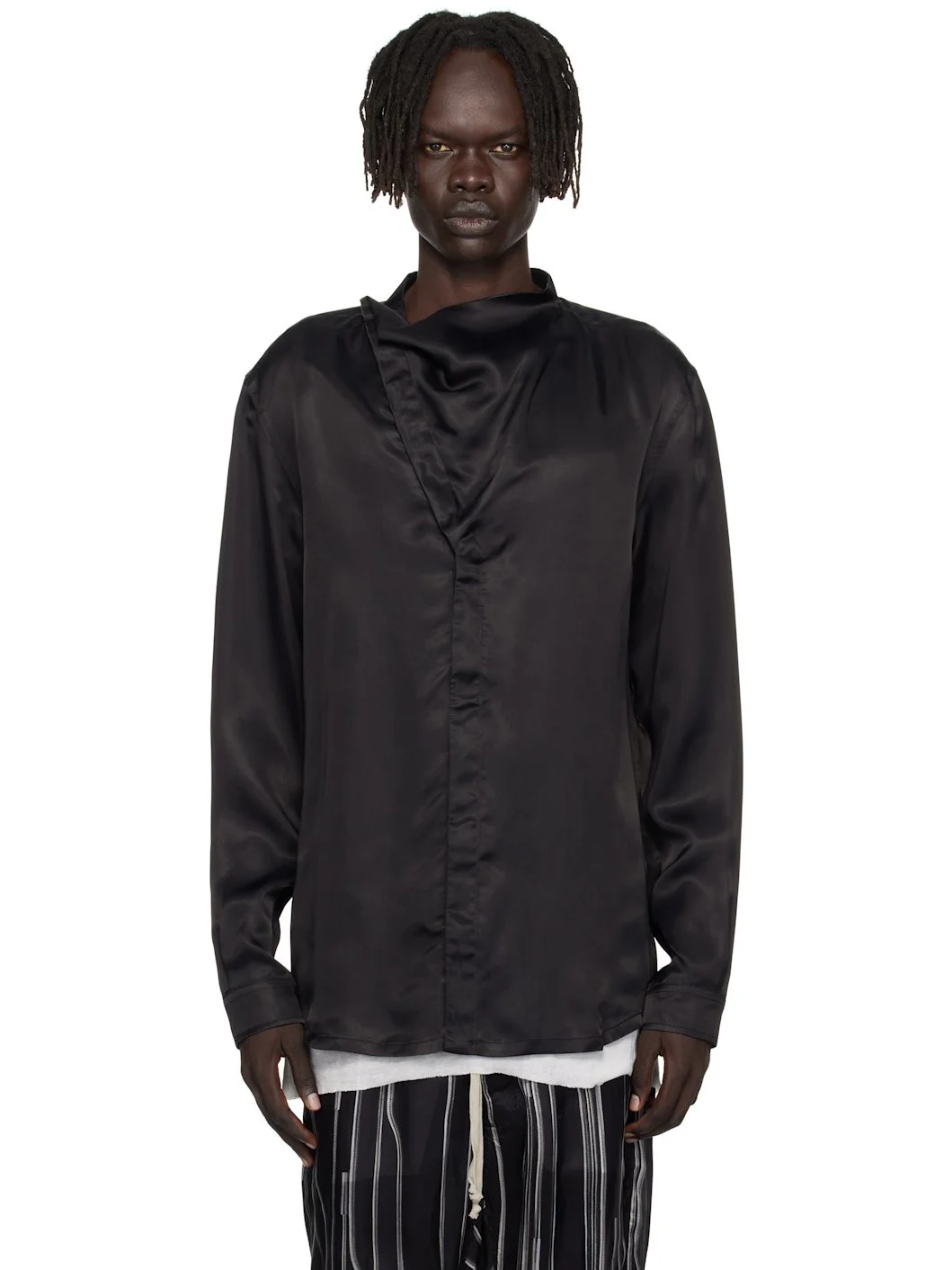 Cupro satin shirt. · Cowl neck · Offset concealed button closure · Shirttail hem · Pleats at buttoned barrel cuffs · Buffalo horn hardware Supplier color: Black 100% cupro. Made in Italy 252232M192020