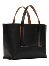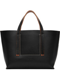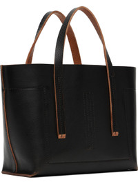Vegetable-tanned buffed leather and bull leather tote. · Subtle fading throughout · Fixed carry handles · White topstitching and logo stamp at face · D-rings at open throat · Card slot, patch pocket, and zip pocket at suede interior · H7.75" x W11.75" x D4" Supplier color: Black Leather, bull leather. Made in Italy 252232M172008