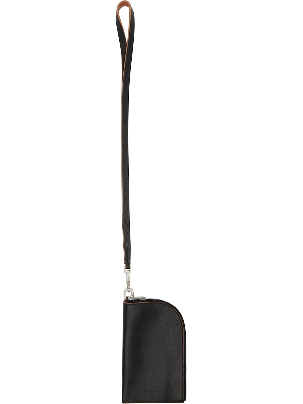 Waxed and vegetable-tanned grained calfskin leather wallet. · Discoloration throughout · LWG-certified leather · Detachable bull leather lanyard · Logo embossed at face · Zip closure · Unlined · Logo-engraved silver-tone hardware · H7" x W4.25" x D0.5" Supplier color: Black Calfskin, bull leather. Made in Italy 252232M164001