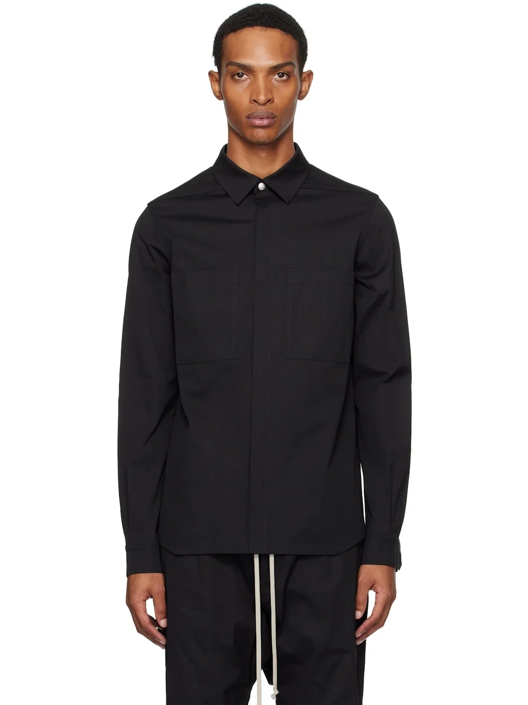 GOTS-certified stretch organic cotton poplin shirt. · Spread collar · Press-stud closure · Patch pockets at chest · Press-stud barrel cuffs · Webbing strap at back yoke Supplier color: Black 97% cotton, 3% elastane. Made in Italy 252232M192014