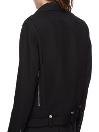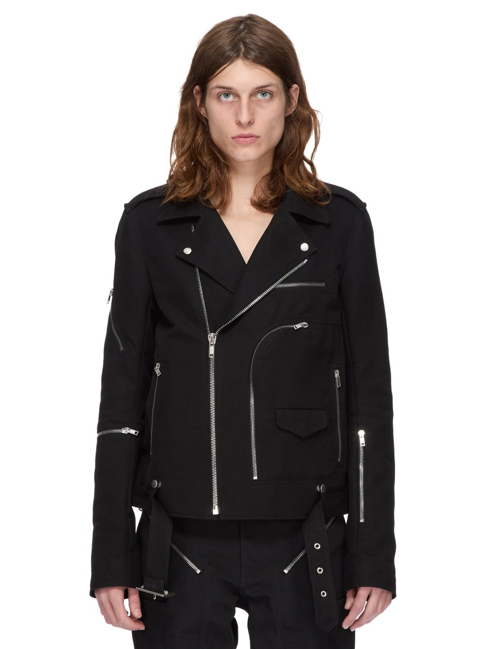 RICK OWENS SS25 HOLLYWOOD BAUHAUS STOOGES IN BLACK STRETCH TERRAIN COTTON THIS JUMBO LUKE STOOGES IS BELOW-HIP-LENGTH WITH LONG SLEEVES AND A JUMBO OVERSIZED FIT. IT FEATURES A BIKER DOUBLE BREASTED FRONT WITH OFF CENTRE ZIPPER A WIDE COLLAR AND LAPEL WITH SNAPS. IT FEATURES A ZIPPERED POCKET ON THE LEFT FOREARM, A JET POCKET WITH ZIP ON THE LEFT CHEST, TWO ON THE SIDE BODY AND ONE FLAP POCKET WITH INNER SNAP ON THE LOWER BODY. IT HAS ZIP OPENINGS AT WRISTS, SHOULDER EPAULETTES WITH SNAP DETAILS AND A DETACHABLE BELT RUNNING THROUGH LOOPS AT THE BACK WAISTBAND WITH A SOLID BRASS PALLADIUM PLATED BUCKLE. THIS ITEM IS PART OF THE RICK OWENS BONOTTO CAPSULE COLLECTION AND FEATURES A SIGNATURE LABEL ON THE INTERIOR THIS MEDIUMWEIGHT COTTON IS COMPACT WITH A CRISPY HAND FEEL. IT HAS A SMALL STRETCH CONTENT FOR ADDED COMFORT. THE FABRIC HAS MINIMAL FINISHING IN ORDER TO KEEP THE NATURAL CHARACTERISTICS OF THE YARNS. THIS FABRIC WAS WOVEN ON A 1950’S VINTAGE SHUTTLE LOOM BY BONOTTO, A 4TH GENERATION TEXTILE MILL FOUNDED IN 1912 SITUATED JUST BELOW THE PREALPS IN VENETO, ITALY. COLOR: BLACK MATERIAL: 91% COTTON 7% POLYAMIDE 2% ELASTANE MODEL IS 189CM TALL MODEL WEARS SIZE 48